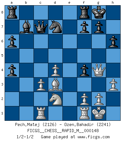 Last move : 1/2-1/2 2023 October 19 14:28:55 [Event "FICGS__CHESS__RAPID_M__000148"] [Site "FICGS"] [Date "2023.08.13"] [Round "1"] [White "Pech,Matej"] [Black "Ozen,Bahadir"] [Result "1/2-1/2"] [WhiteElo "2126"] [BlackElo "2241"] 1.d4 Nf6 2.c4 e6 3.Nc3 Bb4 4.e3 O-O 5.Bd3 d5 6.Nf3 dxc4 7.Bxc4 c5 8.O-O cxd4 9.exd4 b6 10.Bg5 Bb7 11.Qe2 Nbd7 12.Rac1 Bxc3 13.bxc3 Qc7 14.Nd2 h6 15.Bh4 a6 16.Bd3 b5 17.a4 bxa4 18.h3 Nd5 19.Bg3 Nf4 20.Qg4 e5 21.Bxf4 exf4 1/2-1/2 Follow this game move after move (download)A sacrifice is best refuted by accepting it. (Wilhelm Steinitz) Der Umstand, daß uns eine 7 Stunden Zeitkontrolle ermöglicht eine großartige, tiefe Partie zu spielen, ist für die Massenmedien nicht weiter von Bedeutung. (Alexej Shirov) Los errores estan ahí, esperando a que se cometan. (Savielly Tartakower) Dans le domaine de la peinture, de la gravure et de la sculpture, dès la première décennie de notre siècle, les artistes abandonnent la représentation de la partie d'échecs pour se concentrer sur les pièces, sur les échiquiers et sur toutes les variations auxquelles les unes et les autres peuvent donner lieu. On passe en quelque sorte d'un thème social à un thème musical (au sens de la musica médiévale, c'est-à-dire d'une notion qui inclue le rythme, l'harmonie, la construction et la déconstruction, etc.). Graphiquement et picturalement, l'échiquier apparaît comme une structure ouverte, dynamique, d'une richesse infinie, autorisant toutes les combinatoires et débouchant sur des mouvements et des rythmes de nature exponentielle. (Michel Pastoureau) Man is still the most extraordinary computer of all. (John F. Kennedy)