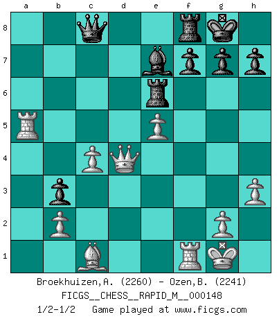 Last move : 1/2-1/2 2023 September 10 9:26:1 [Event "FICGS__CHESS__RAPID_M__000148"] [Site "FICGS"] [Date "2023.08.13"] [Round "1"] [White "Broekhuizen,A. T. S."] [Black "Ozen,Bahadir"] [Result "1/2-1/2"] [WhiteElo "2260"] [BlackElo "2241"] 1.e4 e5 2.Nf3 Nc6 3.Bb5 a6 4.Ba4 Nf6 5.O-O Be7 6.Re1 b5 7.Bb3 O-O 8.h3 Bb7 9.d3 d5 10.exd5 Nxd5 11.Nxe5 Nxe5 12.Rxe5 Qd6 13.Re1 Rae8 14.Nd2 c5 15.Ne4 Qc6 16.c4 Nb6 17.f3 Bh4 18.Rf1 Qc7 19.cxb5 axb5 20.a4 c4 21.dxc4 bxa4 22.Qd6 Qc8 23.Qxb6 Bxe4 24.fxe4 axb3 25.Qd4 Re6 26.e5 Be7 27.Ra5 1/2-1/2 Follow this game move after move (download)A great player and a great example for many. His book My 60 Memorable Games had a big impact on me. It is a shame he didn't continue to enrich the world of chess with his unparalleled understanding after 1972. (Jan Timman, about Bobby Fischer's death) Warum muß ich gegen diesen IDIOTEN verlieren? (Aaron Nimzowitsch) Yo no creo en la psicología. Yo creo en las buenas movidas. (Bobby Fischer) J'ai toujours senti une vague pitié pour l'homme qui ne connaît rien aux échecs, tout comme j'en aurais pour un homme ignorant de l'amour. Les Echecs, comme la musique ou comme l'amour, ont le pouvoir de rendre heureux. (Siegbert Tarrasch) There are lots of people who mistake their imagination for their memory. (Josh Bilings)