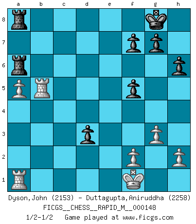Last move : 1/2-1/2 2023 September 29 20:40:13 [Event "FICGS__CHESS__RAPID_M__000148"] [Site "FICGS"] [Date "2023.08.13"] [Round "1"] [White "Dyson,John"] [Black "Duttagupta,Aniruddha"] [Result "1/2-1/2"] [WhiteElo "2153"] [BlackElo "2258"] 1.e4 c6 2.d4 d5 3.e5 Bf5 4.Be2 e6 5.Nf3 c5 6.Be3 cxd4 7.Nxd4 Ne7 8.O-O Nbc6 9.Bb5 a6 10.Bxc6+ bxc6 11.c4 Qd7 12.Nc3 dxc4 13.Na4 Nd5 14.Nxf5 exf5 15.Bd2 Qe6 16.Rc1 Rb8 17.Qc2 Bb4 18.Rfd1 O-O 19.Bxb4 Rxb4 20.a3 Rb5 21.Qxc4 Qxe5 22.b4 Nb6 23.Nxb6 Rxb6 24.Re1 Qb2 25.Rc3 h6 26.g3 a5 27.bxa5 Rb5 28.a6 Ra5 29.Rb3 Qd2 30.Ra1 Qd5 31.Qxd5 cxd5 32.a4 Rxa6 33.a5 Rfa8 34.Rb5 d4 35.Kf1 d3 1/2-1/2 Follow this game move after move (download)Let the perfectionist play postal. (Yasser Seirawan) Capablanka war das größte Genie der Schachgeschichte! Aber denken sie nicht er habe nichts vom Schach verstanden. Er wusste nur soviel wie er wissen musste um seine Ziele zu erreichen. (Mikhail Moiseyevich Botvinik) ¿Cual es el objetivo de jugar una apertura de gambito?... Para adquirir una reputación de ser un jugador apuesto a costo de perder el juego. (Siegbert Tarrasch) L'action d'une oeuvre littéraire se déroule sur un champ de bataille. Les masques et les types du drame moderne correspondent aux pièces du jeu d'échecs. L'intrigue correspond aux coups et aux gambits, c'est à dire aux techniques du jeu telles qu'utilisées et interprétées par les joueurs. Les tactiques et les péripéties [mouvements] correspondent aux coups exécutés par l'adversaire. (Viktor Shklovsky) It's not the will to win, but the will to prepare to win that makes the difference. (Bear Bryant)