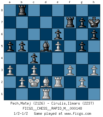 Last move : 1/2-1/2 2023 November 7 6:31:36 [Event "FICGS__CHESS__RAPID_M__000148"] [Site "FICGS"] [Date "2023.08.13"] [Round "1"] [White "Pech,Matej"] [Black "Cirulis,Ilmars"] [Result "1/2-1/2"] [WhiteElo "2126"] [BlackElo "2237"] 1.e4 e6 2.d4 d5 3.Nc3 Nf6 4.Bg5 dxe4 5.Nxe4 Nbd7 6.Nxf6+ Nxf6 7.Nf3 h6 8.Be3 Bd6 9.Bd3 O-O 10.Qe2 b6 11.O-O-O Bb7 12.Ne5 Nd5 13.Bd2 Qh4 14.Nf3 Qf6 15.Qe4 Qg6 16.Qxg6 fxg6 17.Be4 Rab8 18.Rhe1 g5 19.h3 b5 20.a3 a5 21.c3 Rf6 22.Kc2 Bf4 23.Kc1 Bd6 24.Kc2 c5 25.Re2 c4 26.Ne5 Bxe5 27.dxe5 Rf7 28.Bxd5 Bxd5 29.f3 Kh7 1/2-1/2 Follow this game move after move (download)The passed Pawn is a criminal, who should be kept under lock and key. Mild measures, such as police surveillance, are not sufficient. (Aaron Nimzovich) Ein Isolani verdüstert die Stimmung auf dem ganzen Schachbrett. (Savielly Grigorievitsch Tartakower) Haz el enroque temprano y seguido. (Rob Sillars) Le joueur d'Echecs qui veut atteindre le top est obligé de développer son propre credo créatif. Alexeï Stepanovicth Souétine. Il est facile d'écrire des livres ! Ce qui est difficile, c'est de jouer ! (Alexeï Stepanovicth Souétine) All men can see these tactics whereby I conquer, but what none can see is the strategy out of which victory is evolved. (Sun Tzu)