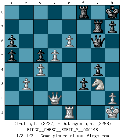 Last move : 1/2-1/2 2023 November 13 17:10:35 [Event "FICGS__CHESS__RAPID_M__000148"] [Site "FICGS"] [Date "2023.08.13"] [Round "1"] [White "Cirulis,Ilmars"] [Black "Duttagupta,Aniruddha"] [Result "1/2-1/2"] [WhiteElo "2237"] [BlackElo "2258"] 1.c4 c5 2.e4 Nc6 3.g3 g6 4.d3 Bg7 5.Nc3 d6 6.Bg2 a6 7.a4 e6 8.Nge2 Nge7 9.O-O O-O 10.b3 b6 11.Rb1 Ra7 12.Be3 Nd4 13.Bd2 Nxe2+ 14.Nxe2 Nc6 15.Bc3 Bxc3 16.Nxc3 e5 17.f4 exf4 18.gxf4 f6 19.Kh1 Kh8 20.Qd2 Rg7 21.Rbe1 Bd7 22.Re3 f5 23.Ne2 Nb4 24.e5 dxe5 25.Rxe5 Bc6 26.d4 Bxg2+ 27.Kxg2 Nc6 28.d5 Nxe5 29.fxe5 f4 30.e6 g5 31.Nc3 Qf6 32.Kh1 Qg6 33.a5 bxa5 34.Re1 f3 35.Ne4 g4 36.Ng3 1/2-1/2 Follow this game move after move (download)When you see a good move, look for a better one. (Emanuel Lasker) Versuche, dich von der Sklaverei der Eröffnungsvarianten zu befreien. Stattdessen soll man gewisse Typenpositionen erlernen, die man eingehend analysiert. (Aaron Nimzowitsch) En el Ajedrez, tal como en la vida, las bendiciones de hoy pueden ser el veneno del mañana. (Assaic) La vie et les Echecs sont tous les deux une lutte constante. (Lasker) May the force be with you. (Han Solo in Star Wars ep.4)