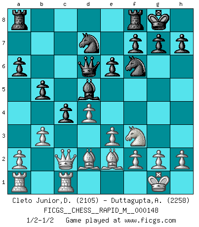 Last move : 1/2-1/2 2023 August 26 6:31:38 [Event "FICGS__CHESS__RAPID_M__000148"] [Site "FICGS"] [Date "2023.08.13"] [Round "1"] [White "Cleto Junior,Dirceu"] [Black "Duttagupta,Aniruddha"] [Result "1/2-1/2"] [WhiteElo "2105"] [BlackElo "2258"] 1.d4 Nf6 2.c4 e6 3.Nf3 d5 4.Nc3 c6 5.e3 Nbd7 6.Qc2 Bd6 7.Bd3 dxc4 8.Bxc4 O-O 9.O-O a6 10.Rd1 b5 11.Bd3 Qc7 12.Bd2 c5 13.Ne4 c4 14.Nxd6 Qxd6 15.Be2 Bb7 16.b3 Bd5 17.Rdc1 1/2-1/2 Follow this game move after move (download)The Pawns are the soul of the game. (Francois Andre Danican Philidor) Das Spiel gibt uns die Genugtuung, die das Leben uns versagt. (Emanuel Lasker) Por esta medida (el intervalo entre Fischer y sus contemporaneos), yo le considero el mas grande campeón mundial. (Garry Kasparov) Psychologiquement, tu dois avoir confiance en toi même, mais cette confiance doit être basée sur des faits. (Robert Fischer) The quality of decision is like the well-timed swoop of a falcon which enables it to strike and destroy its victim. (Sun Tzu)