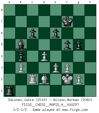 Last move : 1/2-1/2 2023 September 18 10:43:27 [Event "FICGS__CHESS__RAPID_A__000297"] [Site "FICGS"] [Date "2023.08.15"] [Round "1"] [White "Salonen,Jukka"] [Black "Wilson,Norman"] [Result "1/2-1/2"] [WhiteElo "2014"] [BlackElo "2060"] 1.d4 d5 2.c4 c6 3.Nf3 e6 4.e3 Nf6 5.Nc3 Nbd7 6.Bd3 dxc4 7.Bxc4 b5 8.Bd3 b4 9.Ne4 Nxe4 10.Bxe4 Bb7 11.O-O Be7 12.a3 a5 13.Qc2 h6 14.b3 O-O 15.axb4 axb4 16.Bb2 Nf6 17.Rxa8 Qxa8 18.Ra1 Qb8 19.Nd2 Rc8 20.Rc1 Nxe4 21.Nxe4 Ba6 22.Nc5 Bxc5 23.Qxc5 Qb5 24.Qxb5 Bxb5 25.f3 Ra8 26.Rc2 f5 27.Kf2 Kf7 28.h4 g5 29.hxg5 hxg5 30.Bc1 Ra1 31.Bd2 1/2-1/2 Follow this game move after move (download)The older I grow, the more I value pawns. (Paul Keres) Ich spiele 70 Eröffnungssysteme. (Viktor Kortschnoi) En manos de Fischer's, una diminuta ventaja teórica es tan buena como tener una Reina de ventaja. (Isaac Kashdan) Il vaut toujours mieux jouer un plan faux de façon logique que de n'avoir pas de plan du tout. (Victor Kortchnoï) There are 10 types of people in this world: those who understand binary and those who don't. (Anonymous)