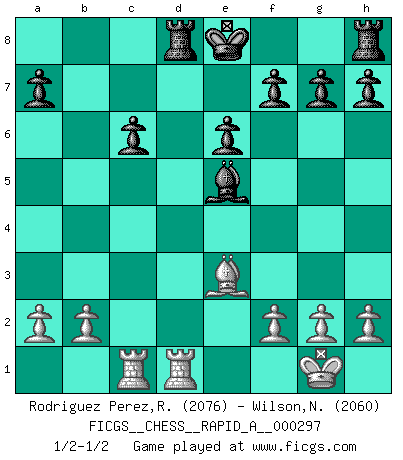 Last move : 1/2-1/2 2023 October 4 17:30:54 [Event "FICGS__CHESS__RAPID_A__000297"] [Site "FICGS"] [Date "2023.08.15"] [Round "1"] [White "Rodriguez Perez,Rene"] [Black "Wilson,Norman"] [Result "1/2-1/2"] [WhiteElo "2076"] [BlackElo "2060"] 1.e4 c6 2.d4 d5 3.e5 Bf5 4.Nf3 e6 5.Be2 c5 6.Be3 cxd4 7.Nxd4 Ne7 8.Nd2 Nbc6 9.N2f3 Bg4 10.O-O Bxf3 11.Nxf3 Ng6 12.c4 dxc4 13.Bxc4 Be7 14.Qxd8+ Bxd8 15.Bb5 Bc7 16.Rac1 Ngxe5 17.Nxe5 Bxe5 18.Rfd1 Rd8 19.Bxc6+ bxc6 1/2-1/2 Follow this game move after move (download)Pawns are born free, yet they are everywhere in chains. (Rick Kennedy) Herr Iljumschinow ist ein etwas merkwürdiger Geschäftsmann: Er arbeitet zusammen mit Leuten wie Muammar al-Gaddafi; früher ist das Saddam Hussein gewesen. (Joel Lautier) Todos los Maestros de Ajedrez fueron un día unos principiantes. (Chernev) Roi des jeux et jeu des rois, les échecs portent en eux un sentiment d'infini. Ils donnent à celui qui s'est efforcé d'en approfondir les arcanes l'impression de n'être pas à la mesure de l'homme; en fait, ils constituent un résumé de l'univers, un microcosme, et figurent cette grande échelle qui, dans les plans de la lumière descend jusqu'à la matière, qui des abîmes insondables remonte jusqu'en l'infini de Dieu. (Pyrame) There are three kinds of lies: lies, damned lies and statistics. (Mark Twain)