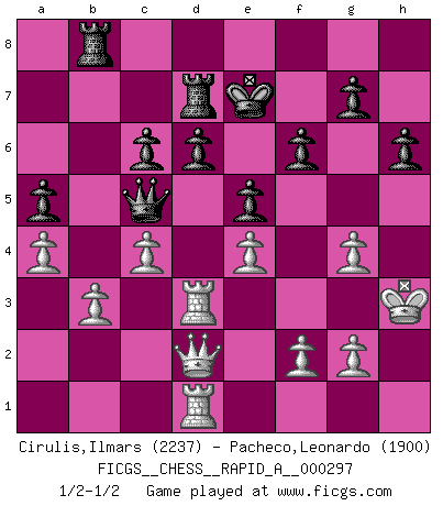 Last move : 1/2-1/2 2023 October 2 22:52:11 [Event "FICGS__CHESS__RAPID_A__000297"] [Site "FICGS"] [Date "2023.08.15"] [Round "1"] [White "Cirulis,Ilmars"] [Black "Pacheco,Leonardo"] [Result "1/2-1/2"] [WhiteElo "2237"] [BlackElo "1900"] 1.e4 c5 2.c4 Nc6 3.Ne2 Nf6 4.Nbc3 e6 5.d4 cxd4 6.Nxd4 Bb4 7.Nxc6 bxc6 8.Bd3 e5 9.O-O O-O 10.h3 Bc5 11.Qf3 Rb8 12.Bc2 d6 13.Rb1 Be6 14.b3 h6 15.Bd2 Qe7 16.Rbd1 Rfd8 17.Be3 Bb4 18.Bc1 Bc5 19.Be3 Bb4 20.Rd3 Nd7 21.Bc1 Kh8 22.Na4 Nc5 23.Nxc5 Bxc5 24.Qh5 Kh7 25.Rg3 Qf8 26.Be3 Bxe3 27.Rxe3 a5 28.Qe2 Qe7 29.a4 f6 30.Qd2 Qc7 31.Rd3 Rd7 32.Bd1 Rbd8 33.Bg4 Bxg4 34.hxg4 Kg8 35.Rd1 Qb6 36.Kh1 Qc5 37.Kh2 Kf7 38.Kh3 Ke7 39.Kg3 Rb8 40.Kh3 1/2-1/2 Follow this game move after move (download)In the perfect Chess combination as in a first-rate short story, the whole plot and counter-plot should lead up to a striking finale, the interest not being allayed until the very last moment. (Yates and Winter) Der Schachmeister von Heute braucht Courage, einen Killerinstinkt, Ausdauer und Arroganz. (Larry Evans) Te sientas frente a un tablero y repentinamente tu corazón brinca. Tu mano tiembla al tomar una pieza y moverla. Pero lo que el Ajedrez te enseña es que tu debes permanecer ahí con calma y pensar de que si realmente es una buena idea o de que si hay otras ideas mejores. (Stanley Kubrick) Les Echecs sont affaire de jugement sensible. Savoir quand frapper et quand esquiver. (Fischer) He who fights with monsters should be careful lest he thereby become a monster. (Friedrich Nietzsche, Beyond Good and Evil)