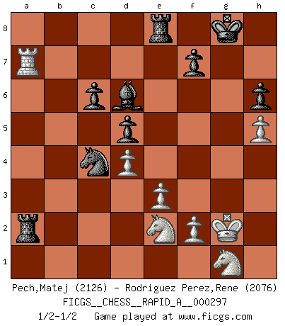 Last move : 1/2-1/2 2024 January 14 6:7:25 [Event "FICGS__CHESS__RAPID_A__000297"] [Site "FICGS"] [Date "2023.08.15"] [Round "1"] [White "Pech,Matej"] [Black "Rodriguez Perez,Rene"] [Result "1/2-1/2"] [WhiteElo "2126"] [BlackElo "2076"] 1.c4 e6 2.d4 d5 3.Nc3 Nf6 4.Bg5 Nbd7 5.cxd5 exd5 6.e3 c6 7.Bd3 Be7 8.Nf3 Nf8 9.Qc2 Ne6 10.Bh4 g6 11.O-O O-O 12.Rab1 Ng7 13.b4 a6 14.a4 Bf5 15.b5 Bxd3 16.Qxd3 axb5 17.axb5 Nf5 18.Bxf6 Bxf6 19.bxc6 bxc6 20.Rfc1 Ra3 21.Qc2 Qa5 22.Qb2 Nd6 23.Qb6 Rc8 24.Qxa5 Rxa5 25.g4 Nc4 26.Kg2 Be7 27.h4 Bd6 28.Rb7 Re8 29.Rd7 Bb4 30.Nd1 Ra2 31.Rb1 Bf8 32.R1b7 Ra1 33.Nb2 Ra2 34.Nd1 Ra1 35.Nc3 Rc1 36.Ne2 Rc2 37.Nfg1 h6 38.Ra7 Nd6 39.h5 gxh5 40.gxh5 Nb5 41.Ra6 Bd6 42.Rb7 Nc7 43.R6a7 Nb5 44.Ra1 Na3 45.Ra7 Nc4 46.R1a2 Rxa2 1/2-1/2 Follow this game move after move (download)There is only one thing Fischer does in Chess without pleasure: to lose ! (Boris Spassky) Unter Putin wird alles Geld aus Russland wie von einem Staubsauger nach Moskau umgeleitet, das ist wie ein schwarzes Loch. (Garry Kasparov) Alguna parte de un error es siempre correcto. (Savielly Tartakover) Lorsque vous vous retrouvez devant une position atroce, ne tendez pas un ultime piège dérisoire avec l'intention d'abandonner si l'adversaire le déjoue ! Faites-vous plutôt un devoir de résister comme si votre vie en dépendait. Jouez le coup qui vous déplairait au centuple si vous étiez dans la peau de votre tortionnaire ! Remember : Your focus determines your reality. (Qui-Gon Jinn in Star Wars ep.1)