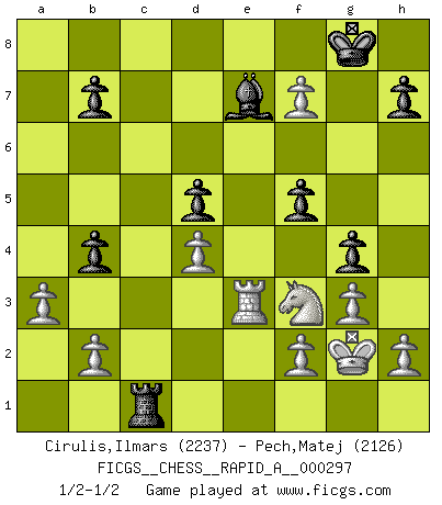 Last move : 1/2-1/2 2023 November 7 6:28:15 [Event "FICGS__CHESS__RAPID_A__000297"] [Site "FICGS"] [Date "2023.08.15"] [Round "1"] [White "Cirulis,Ilmars"] [Black "Pech,Matej"] [Result "1/2-1/2"] [WhiteElo "2237"] [BlackElo "2126"] 1.e4 c6 2.d4 d5 3.e5 Bf5 4.Be2 e6 5.Nf3 c5 6.Be3 cxd4 7.Nxd4 Ne7 8.O-O Nbc6 9.Bb5 a6 10.Bxc6+ Nxc6 11.Nxf5 exf5 12.c3 Be7 13.Bd4 O-O 14.Qd3 g6 15.Re1 Rc8 16.Nd2 Nxd4 17.cxd4 Qb6 18.Nf3 Rc6 19.Re2 Rfc8 20.g3 Qb5 21.Qxb5 axb5 22.Re3 Rc1+ 23.Rxc1 Rxc1+ 24.Kg2 b4 25.a3 g5 26.e6 g4 27.exf7+ 1/2-1/2 Follow this game move after move (download)Why must I lose to this idiot ? (Aron Nimzovich) Man wirke der falschen Auffassung entgegen, als ob jeder Zug Unmittelbares zu leisten habe; auch Werte- und Ruhezüge haben ihre Existenzberechtigung. (Aaron Nimzowitsch) El Ajedrez es sobre todo, ¡una pelea!. (Emanuel Lasker) L'ordinateur a tué l'originalité. Il n'y a plus guère d'aventures sur l'échiquier. (Jacob Murray) Thus, what is of supreme importance in war is to attack the enemy's strategy. (Sun Tzu)