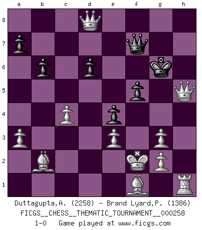 Last move : 1-0 2023 September 18 20:10:57 [Event "FICGS__CHESS__THEMATIC_TOURNAMENT__000258"] [Site "FICGS"] [Date "2023.08.25"] [Round "1"] [White "Duttagupta,Aniruddha"] [Black "Brand Lyard,Paul"] [Result "1-0"] [WhiteElo "2258"] [BlackElo "1386"] 1.d4 Nf6 2.c4 e5 3.dxe5 Ne4 4.a3 Bc5 5.e3 O-O 6.Qd5 Nxf2 7.Kxf2 b6 8.Qxa8 Nc6 9.Nf3 Re8 10.b4 Bf8 11.Nc3 h5 12.Bb2 g6 13.Ne4 f5 14.Nf6+ Kf7 15.Ng5+ Kg7 16.Nxe8+ Qxe8 17.e6 Kh6 18.Nf7+ Kh7 19.b5 dxe6 20.bxc6 Qxf7 21.Qxc8 g5 22.Rd1 Bd6 23.Qh8+ Kg6 24.Rxd6 cxd6 25.c7 e5 26.c8Q g4 27.Qc8d8 g3+ 28.hxg3 e4 29.Qxh5+ 1-0 Follow this game move after move (download)Combinations have always been the most intriguing aspect of Chess. The masters look for them, the public applauds them, the critics praise them. It is because combinations are possible that Chess is more than a lifeless mathematical exercise. They are the poetry of the game; they are to Chess what melody is to music. They represent the triumph of mind over matter. (Reuben Fine) Was ist der Unterschied zwischen einem Strassenarbeiter und einem Schachspieler? --Der Schachspieler bewegt sich ab und zu. (Anonymous) Todos los Maestros de Ajedrez fueron un día unos principiantes. (Chernev) Ce n'est pas pour s'amuser qu'il joue aux échecs : il célèbre un culte. (Vladimir Nabokov) I believe in luck. How else can you explain the success of those you dislike ? (Jean Cocteau)