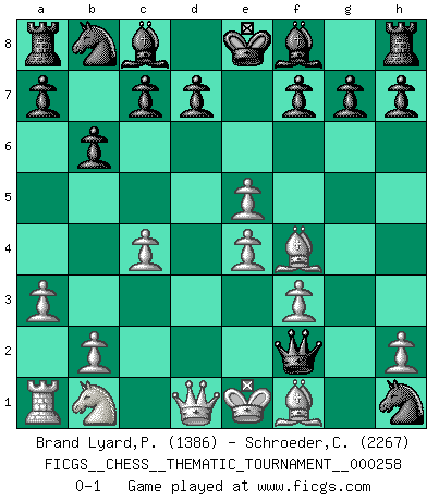 Last move : 0-1 2023 August 30 18:25:24 [Event "FICGS__CHESS__THEMATIC_TOURNAMENT__000258"] [Site "FICGS"] [Date "2023.08.25"] [Round "1"] [White "Brand Lyard,Paul"] [Black "Schroeder,Christoph"] [Result "0-1"] [WhiteElo "1386"] [BlackElo "2267"] 1.d4 Nf6 2.c4 e5 3.dxe5 Ne4 4.a3 b6 5.f3 Qh4+ 6.g3 Nxg3 7.Kd2 Nxh1 8.e4 Qg5+ 9.Ke1 Qxg1 10.Bf4 Qf2+ 0-1 Follow this game move after move (download)White lost because he failed to remember the right continuation and had to think up the moves himself. (Siegbert Tarrasch) Kein Schachspieler kann gut schlafen. (H. G. Wells) La captura del Rey enemigo es la finalidad pero no el primer objetivo de la partida. (William Steinitz) Le succès, c'est être capable d'aller d'échec en échec sans perdre son enthousiasme. (Winston Churchill) He is a liar. I just don't know what the lie is yet. (Horatio Caine, C.S.I. Miami)