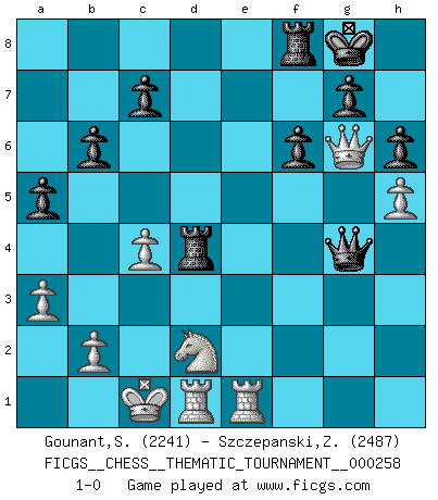 Last move : 1-0 2023 October 23 12:16:35 [Event "FICGS__CHESS__THEMATIC_TOURNAMENT__000258"] [Site "FICGS"] [Date "2023.08.25"] [Round "1"] [White "Gounant,Stanislas"] [Black "Szczepanski,Zbigniew"] [Result "1-0"] [WhiteElo "2241"] [BlackElo "2487"] 1.d4 Nf6 2.c4 e5 3.dxe5 Ne4 4.a3 d6 5.Qc2 Nc5 6.exd6 Bxd6 7.Nc3 O-O 8.Nf3 Qf6 9.e4 Re8 10.Be3 Bg4 11.Nd2 a5 12.f3 Be6 13.Be2 Nbd7 14.Nb5 Qe7 15.Nxd6 Qxd6 16.g4 Rad8 17.O-O-O f6 18.h4 b6 19.h5 h6 20.f4 Qe7 21.e5 Nf8 22.Bxc5 Qxc5 23.f5 Qxe5 24.fxe6 Qxe2 25.Rhe1 Qxg4 26.e7 Rd4 27.exf8Q+ Rxf8 28.Qg6 1-0 Follow this game move after move (download)Chess is a fairy tale of 1001 blunders. (Savielly Tartakower) Wenn Du einsam bist, wenn Du Dich in der Welt wie ein Fremder fühlst, spiele Schach. Das wird Deinen Geist erheben und Dein Ratgeber im Kampf sein. (Aristoteles) ¿Porque tengo que perder ante este idiota?. (Aron Nimzovich) On peut tirer plus d'utilité d'une partie perdue que de 100 parties gagnées. (Capablanca) Without deviation from the norm, progress is not possible. (Frank Zappa)