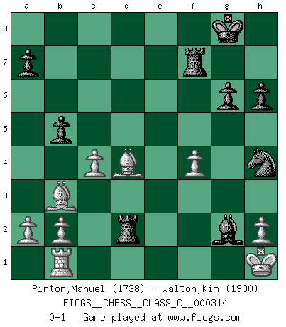 Last move : 0-1 2023 September 18 15:4:38 [Event "FICGS__CHESS__CLASS_C__000314"] [Site "FICGS"] [Date "2023.08.28"] [Round "1"] [White "Pintor,Manuel"] [Black "Walton,Kim"] [Result "0-1"] [WhiteElo "1738"] [BlackElo "1900"] 1.e4 c5 2.f4 g6 3.Nf3 Bg7 4.Bc4 Nc6 5.d3 e6 6.O-O Nge7 7.c3 O-O 8.Kh1 d5 9.exd5 exd5 10.Bb3 d4 11.cxd4 Nxd4 12.Nxd4 Bxd4 13.Nc3 Nf5 14.Qf3 Rb8 15.Ne4 b5 16.Rb1 Bb7 17.Qh3 c4 18.Ng5 h6 19.Nxf7 Qh4 20.Qxh4 Nxh4 21.Rg1 Rxf7 22.dxc4 Re8 23.Bd2 Re2 24.Bc3 Rxg2 25.Bxd4 Rd2 26.Rg2 Bxg2+ 0-1 Follow this game move after move (download)You can only get good at Chess if you love the game. (Bobby Fischer) Schach ist eine Sache der genauen Beurteilung, wann man zuschlagen und wann man sich ducken muss. (Robert James Fischer) El jugador de combinación piensa hacia adelante; comienza de la posición dada y trabaja las movidas contundentes en su mente. (Emanuel Lasker) Le succès, c'est être capable d'aller d'échec en échec sans perdre son enthousiasme. (Winston Churchill) When you have everything, sometimes it feels like nothing. (Horatio Caine, C.S.I. Miami)