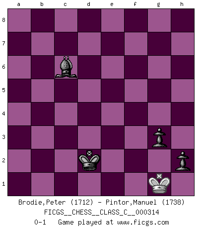 Last move : 0-1 2024 April 29 5:57:15 [Event "FICGS__CHESS__CLASS_C__000314"] [Site "FICGS"] [Date "2023.08.28"] [Round "1"] [White "Brodie,Peter"] [Black "Pintor,Manuel"] [Result "0-1"] [WhiteElo "1712"] [BlackElo "1738"] 1.d4 d5 2.c4 c6 3.c5 Bf5 4.Nf3 Nf6 5.Nc3 e6 6.e3 Be7 7.Bd3 Ne4 8.Bxe4 dxe4 9.Nd2 O-O 10.O-O Nd7 11.Ndxe4 Nf6 12.Nxf6+ Bxf6 13.Qf3 Qc7 14.e4 Bg6 15.Bf4 e5 16.dxe5 Bxe5 17.Bxe5 Qxe5 18.Qe3 Rfe8 19.Rad1 Rad8 20.f4 Qh5 21.Qf3 Qxc5+ 22.Qf2 Qxf2+ 23.Rxf2 Rxd1+ 24.Nxd1 Rxe4 25.Nc3 Re1+ 26.Rf1 Rxf1+ 27.Kxf1 h5 28.Kf2 b5 29.b4 f6 30.Kf3 Kf7 31.Ne2 Ke7 32.Nd4 Kd6 33.f5 Bf7 34.a3 Bd5+ 35.Kf2 Ke5 36.Ke3 Bxg2 37.h4 Bd5 38.Kd3 Be4+ 39.Ke3 Kd5 40.Nxc6 Bxf5 41.Nxa7 Bd7 42.Kf4 Kd4 43.Kf3 g5 44.hxg5 fxg5 45.Kf2 Kc3 46.Nxb5+ Bxb5 47.Kf3 Bc6+ 48.Kg3 Kb3 49.b5 Bxb5 50.Kf3 Bc6+ 51.Kg3 Kxa3 52.Kh3 Kb2 53.Kg3 Kc2 54.Kf2 h4 55.Kg1 g4 56.Kh2 Kd2 57.Kg1 g3 58.Kf1 h3 59.Kg1 h2+ 0-1 Follow this game move after move (download)Chess holds its master in its own bonds, shackling the mind and brain so that the inner freedom of the very strongest must suffer. (Albert Einstein) Die unerbitterlichsten Regeln im Schach sind die Ausnahmen. (Savielly Grigorievitsch Tartakower) Una clavada es mas poderosa que una espada. (Fred Reinfeld) Vous n'êtes pas toujours obligé de jouer le meilleur coup. Un coup doit être actif, entreprenant, correct et beau ! (David Bronstein) The weakness of an artist is dogma. (Josh Waitzkin)