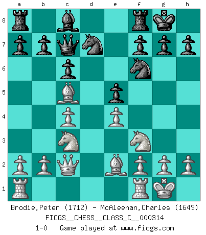 Last move : 1-0 2023 December 17 17:37:4 [Event "FICGS__CHESS__CLASS_C__000314"] [Site "FICGS"] [Date "2023.08.28"] [Round "1"] [White "Brodie,Peter"] [Black "McAleenan,Charles"] [Result "1-0"] [WhiteElo "1712"] [BlackElo "1649"] 1.Nf3 d6 2.d4 Nf6 3.c4 Nbd7 4.Nc3 e5 5.dxe5 dxe5 6.Qc2 Be7 7.e4 c6 8.Be2 Qc7 9.O-O O-O 10.Be3 Bc5 11.Bxc5 1-0 Follow this game move after move (download)In blitz, the Knight is stronger than the Bishop. (Vlastimil Hort) Ein Springer auf f6 gegen die eigene Rochadestellung ist schlimmer als ein rostiger Nagel im Knie. (Efim Bogoljubov) Fischer sacrificó virtualmente todo lo que la mayoría de nosotros los 'debiles' (término que él usa) valoramos, respetamos y apreciamos por el amor de un astuto, a menudo hermoso tablero de juego, por el privilegio ambivalente de ser su mas grande maestro. (Paul Kollar) Il s'avisa de me proposer d'apprendre les échecs qu'il jouait un peu... me voilà forcené des échecs. J'achète un échiquier, je m'enferme dans ma chambre, j'y passe des jours et des nuits à vouloir apprendre par cur toutes les parties. (Jean-Jacques Rousseau, Confessions) Now you put water in a cup, it becomes the cup; You put water into a bottle it becomes the bottle; You put it in a teapot it becomes the teapot. Water can flow or it can crash. Be water, my friend. (Bruce Lee)