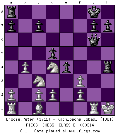 Last move : 0-1 2024 January 28 21:54:29 [Event "FICGS__CHESS__CLASS_C__000314"] [Site "FICGS"] [Date "2023.08.28"] [Round "1"] [White "Brodie,Peter"] [Black "Kachibacha,Jobadi"] [Result "0-1"] [WhiteElo "1712"] [BlackElo "1981"] 1.e4 e5 2.Nf3 Nc6 3.Bb5 f5 4.Nc3 fxe4 5.Nxe4 d5 6.Bxc6+ bxc6 7.Nc3 e4 8.Qe2 Nf6 9.O-O Bd6 10.Nd4 O-O 11.Nxc6 Qe8 12.Nd4 Bxh2+ 13.Kxh2 Ng4+ 14.Kg1 Qh5 15.Qxg4 Bxg4 16.b4 Bf3 17.gxf3 Qg6+ 18.Kh1 Rf4 19.Rg1 Rh4+ 0-1 Follow this game move after move (download)Fischer is an American Chess tragedy on par with Morphy and Pillsbury. (Mig Greengard) Was ist der Unterschied zwischen einem Strassenarbeiter und einem Schachspieler? --Der Schachspieler bewegt sich ab und zu. (Anonymous) Entre mas años cumplo, mas valoro los Peones. (Keres) Les Echecs sont affaire de jugement sensible. Savoir quand frapper et quand esquiver. (Fischer) Panic is a sudden desertion of us, an a going over to the enemy of our imagination. (Christian Nevell Bovee)