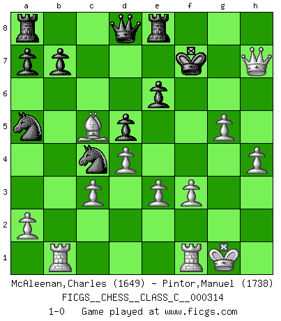 Last move : 1-0 2023 September 27 17:15:59 [Event "FICGS__CHESS__CLASS_C__000314"] [Site "FICGS"] [Date "2023.08.28"] [Round "1"] [White "McAleenan,Charles"] [Black "Pintor,Manuel"] [Result "1-0"] [WhiteElo "1649"] [BlackElo "1738"] 1.d4 d5 2.Nc3 Nf6 3.Bf4 Bf5 4.f3 e6 5.g4 Bg6 6.h4 h5 7.g5 Nfd7 8.e3 Bb4 9.Bd3 Bxc3+ 10.bxc3 Bxd3 11.cxd3 c5 12.dxc5 Nxc5 13.d4 Ncd7 14.Qd3 O-O 15.Ne2 g6 16.O-O Nc6 17.Bd6 Re8 18.Rab1 Nb6 19.Bc5 Na5 20.Nf4 Nbc4 21.Nxg6 fxg6 22.Qxg6+ Kh8 23.Qxh5+ Kg7 24.Qh6+ Kf7 25.Qh7+ 1-0 Follow this game move after move (download)You must take your opponent into a deep dark forest where 2+2=5, and the path leading out is only wide enough for one. (Mikhail Tal) Schach ist das schnellste Spiel der Welt, weil man in jeder Sekunde Tausende von Gedanken ordnen muß. (Albert Einstein) a manera como él juega al Ajedrez, demuestra la completa naturaleza de un hombre. (Stanley Ellin) Il n'y a pas de prix trop élevé au scalp de l'ennemi. (Koblentz) To send light into the darkness of men's hearts - such is the duty of the artist. (Schumann)