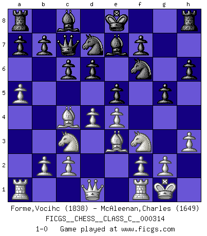 Last move : 1-0 2023 November 11 15:3:43 [Event "FICGS__CHESS__CLASS_C__000314"] [Site "FICGS"] [Date "2023.08.28"] [Round "1"] [White "Forme,Vocihc"] [Black "McAleenan,Charles"] [Result "1-0"] [WhiteElo "1838"] [BlackElo "1649"] 1.e4 d6 2.Nf3 Nf6 3.Nc3 e5 4.d4 Nbd7 5.Bc4 Be7 6.O-O h6 7.a4 c6 8.Be3 Qc7 9.h3 g5 10.a5 1-0 This chess game has been lost on time (started : 2023.08.28 18:36:33) Follow this game move after move (download)The Pawns are the soul of the game. (Francois Andre Danican Philidor) Sicherlich können nur Meister einen Stil haben. Daß ein nicht-Meister auch nur ein einziges Mal in seinem Leben eine Partie folgerecht durchführte, habe ich niemals bemerkt. (Emanuel Lasker) El Rey es una pieza de pelea. ¡Usenlo!. (Wilhelm Steinitz) Un footballeur joue avec ses pieds, parfois avec sa tête. Un joueur d'échecs ne joue qu'avec sa tête. Et quand il ne joue plus, il meurt. (Jacob Murray) A person who never made a mistake never tried anything new. (Albert Einstein)