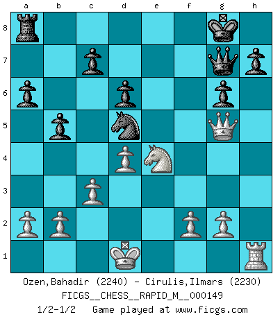 Last move : 1/2-1/2 2023 September 10 18:39:16 [Event "FICGS__CHESS__RAPID_M__000149"] [Site "FICGS"] [Date "2023.09.02"] [Round "1"] [White "Ozen,Bahadir"] [Black "Cirulis,Ilmars"] [Result "1/2-1/2"] [WhiteElo "2240"] [BlackElo "2230"] 1.Nf3 d6 2.d4 Nf6 3.Nc3 g6 4.e4 Bg7 5.Be3 O-O 6.Qd2 a6 7.Bh6 b5 8.Bd3 Nc6 9.Nd5 Bg4 10.c3 Re8 11.h4 Nxd5 12.exd5 e5 13.O-O-O e4 14.h5 Qf6 15.Bxg7 Qxg7 16.hxg6 fxg6 17.Ng5 Bxd1 18.Bxe4 Rxe4 19.Nxe4 Ne7 20.Kxd1 Nxd5 21.Qg5 1/2-1/2 Follow this game move after move (download)Fischer Chess play was always razor-sharp, rational and brilliant. One of the best ever. (Dave Regis) In der Schule lernt man nichts. Es ist nur Zeitverschwendung. (Robert James Fischer) Vive, pierde y aprende al observar a tu oponente como ganar. (Amber Steenbock) Tous ces prétendus hommes politiques sont les pions, les Cavaliers, les Tours ou les Fous d'une partie d'échecs qui se jouera tant qu'un hasard ne renversera pas l'échiquier. (Honoré de Balzac) No enterprise is more likely to succeed than one concealed from the enemy until it is ripe for execution. (Niccolo Machiavelli)