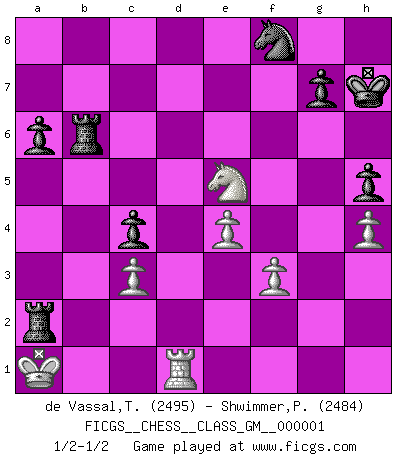 Last move : 1/2-1/2 2008 March 28 2:2:56 [Event "FICGS__CHESS__CLASS_GM__000001"] [Site "FICGS"] [Date "2007.09.06"] [Round "1"] [White "de Vassal,Thibault"] [Black "Shwimmer,Peter"] [Result "1/2-1/2"] [WhiteElo "2495"] [BlackElo "2484"] 1.e4 c5 2.Nf3 d6 3.d4 cxd4 4.Nxd4 Nf6 5.Nc3 a6 6.Be3 e5 7.Nb3 Be6 8.f3 Be7 9.Qd2 h5 10.O-O-O Nbd7 11.Kb1 b5 12.a3 O-O 13.h3 Nb6 14.Qf2 Nc4 15.Bxc4 bxc4 16.Nc5 Rb8 17.N5a4 Qc7 18.g4 Rb7 19.Rhg1 Rfb8 20.Ka1 Kh8 21.g5 Ne8 22.g6 fxg6 23.Rxg6 Bf6 24.R6g1 Qf7 25.Bg5 Bd7 26.h4 Bxg5 27.Rxg5 Bxa4 28.Nxa4 Nf6 29.Qd2 Qe8 30.Nc3 Nh7 31.Rg2 Rxb2 32.Qxd6 Qf8 33.Rf2 Kg8 34.a4 R2b6 35.Qxf8+ Nxf8 36.Nd5 Rb2 37.Ne7+ Kh7 38.Nc6 R8b6 39.Nxe5 R2b4 40.c3 Rxa4+ 41.Ra2 Rxa2+ 1/2-1/2 Sicilian : Najdorf, Byrne (English) attack Queenside Castling by player White (move 10) Kingside Castling by player Black (move 12) This chess game ended in a draw. Follow this game move after move (download)Chess is not like life... it has rules ! (Mark Pasternak) Ich habe die Schachforschung dermaßen betrieben, dass sie auf eine wissenschaftliche Basis gestellt wurde. (Mikhail Moiseyevich Botvinik) Cuando tu casa esta en llamas, no puedes ser molestado por tus vecinos. O, como decinos en Ajedrez, si tu Rey esta bajo ataque, no te preocupa perder un Peón del lado de la Reina. (Gary Kasparov) Des idées, des idées, j'en ai cent, j'en ai mille. Des bonnes, des mauvaises, applicables, irréalisables... Il suffit de faire le tri ! (Roos) Whatever you do, don't be bored. This is absolutely the most exciting time we could have possibly hoped to be alive. And things are just starting. (From movie Waking life)