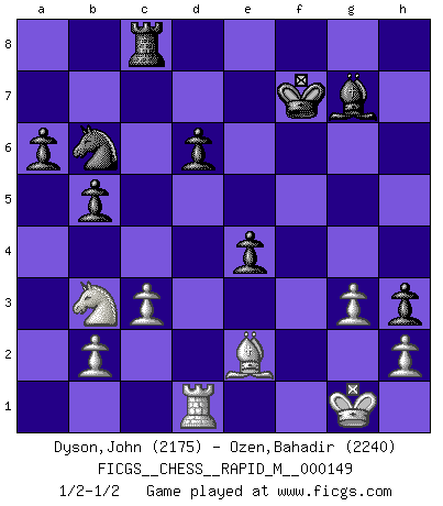 Last move : 1/2-1/2 2023 September 30 22:17:48 [Event "FICGS__CHESS__RAPID_M__000149"] [Site "FICGS"] [Date "2023.09.02"] [Round "1"] [White "Dyson,John"] [Black "Ozen,Bahadir"] [Result "1/2-1/2"] [WhiteElo "2175"] [BlackElo "2240"] 1.e4 c5 2.Nc3 d6 3.Nf3 Nf6 4.d4 cxd4 5.Nxd4 a6 6.f3 e5 7.Nb3 Be6 8.Be3 h5 9.Nd5 Bxd5 10.exd5 Nbd7 11.Qd2 g6 12.Be2 Bg7 13.O-O b6 14.a4 O-O 15.Rad1 h4 16.Qb4 Qc7 17.c3 h3 18.g3 b5 19.a5 e4 20.f4 Rac8 21.f5 Ne5 22.fxg6 Nc4 23.gxf7+ Rxf7 24.Bb6 Nxb6 25.axb6 Qxb6+ 26.Qd4 Nxd5 27.Qxb6 Nxb6 28.Rxf7 Kxf7 1/2-1/2 Follow this game move after move (download)For surely of all the drugs in the world, Chess must be the most permanently pleasurable. (Assiac) Gewinnen beim Schach fördert das Selbstvertrauen. Beim Sex spüre ich sowas nicht... (Garry Kasparov) Un jugador que trata de regresar una movida en el Ajedrez es un futuro carterista. (Richard Fenton) Le thème de l'attaque double intervient d'une manière ou d'une autre dans l'immense majorité des combinaisons. (Youri Averbakh) Those parts of the system that you can hit with a hammer (not advised) are called hardware; those program instructions that you can only curse at are called software. (Anonymous)