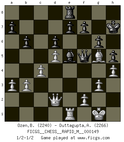 Last move : 1/2-1/2 2023 November 8 16:57:43 [Event "FICGS__CHESS__RAPID_M__000149"] [Site "FICGS"] [Date "2023.09.02"] [Round "1"] [White "Ozen,Bahadir"] [Black "Duttagupta,Aniruddha"] [Result "1/2-1/2"] [WhiteElo "2240"] [BlackElo "2266"] 1.Nf3 Nf6 2.c4 c5 3.g3 b6 4.Bg2 Bb7 5.O-O g6 6.d4 cxd4 7.Qxd4 Bg7 8.Nc3 d6 9.Rd1 Nbd7 10.Be3 O-O 11.Qh4 Rc8 12.b3 Nc5 13.Rac1 Nce4 14.Nxe4 Bxe4 15.Bd4 Bc6 16.Ng5 h5 17.Bxc6 Rxc6 18.Ne4 Nxe4 19.Qxe4 Qd7 20.Be3 Rc7 21.Rd5 Qg4 22.Qd3 Qh3 23.Bg5 Re8 24.e4 Rc5 25.Re1 Be5 26.Qd2 Kh7 27.a3 Rxd5 28.exd5 Qf5 29.h4 1/2-1/2 Follow this game move after move (download)You know, comrade Pachman, I don't enjoy being a Minister, I would rather play Chess like you. (Che Guevara) Als er Schachweltmeister wurde ließ er praktisch alle stärksten Sovietspieler für sich arbeiten. Wenn ein auch nur mittelmässiger Meister ein Spezialist für eine bestimmte Eröffnung war, wurde er von Karpov gerufen. Das wurde alles geheim gehalten. (Mikhail Moiseyevich Botvinik) Me siento como si fuera una pieza en una partida de Ajedrez, cuando mi oponente me indica: esa pieza no puede ser movida. (Soren Kierkegaard) Il s'avisa de me proposer d'apprendre les échecs qu'il jouait un peu... me voilà forcené des échecs. J'achète un échiquier, je m'enferme dans ma chambre, j'y passe des jours et des nuits à vouloir apprendre par cur toutes les parties. (Jean-Jacques Rousseau, Confessions) Who needs drugs and alcohol if he can play Big Chess at FICGS ? (Heinz-Georg Lehnhoff)