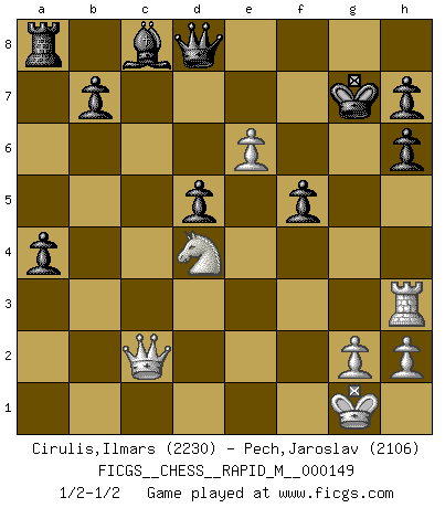Last move : 1/2-1/2 2023 November 24 23:11:8 [Event "FICGS__CHESS__RAPID_M__000149"] [Site "FICGS"] [Date "2023.09.02"] [Round "1"] [White "Cirulis,Ilmars"] [Black "Pech,Jaroslav"] [Result "1/2-1/2"] [WhiteElo "2230"] [BlackElo "2106"] 1.e4 e6 2.d4 d5 3.e5 c5 4.c3 Nc6 5.Nf3 Qb6 6.Be2 cxd4 7.cxd4 Nh6 8.Bxh6 Qxb2 9.O-O gxh6 10.Nbd2 Nxd4 11.Rb1 Nxe2+ 12.Qxe2 Qa3 13.Nd4 a6 14.Rfc1 Qxa2 15.Qe3 Qa3 16.Rc3 Qe7 17.Nf1 Bg7 18.Ng3 O-O 19.Nh5 Qh4 20.Nxg7 Kxg7 21.Qd2 Kh8 22.Rc7 Qg5 23.f4 Qd8 24.Qc2 a5 25.Rb3 a4 26.Rh3 Rg8 27.Rxf7 Rg7 28.Rxg7 Kxg7 29.f5 exf5 30.e6 1/2-1/2 Follow this game move after move (download)I believe that Chess possesses a magic that is also a help in advanced age. A rheumatic knee is forgotten during a game of Chess and other events can seem quite unimportant in comparison with a catastrophe on the chessboard. (Vlastimil Hort) Je mehr wir mit Computern analysieren, desto mehr glauben wir an Verteidigung. (Vladimir Kramnik) Los problemas de Ajedrez exigen del compositor las mismas virtudes que caracterizan todo el arte de valor: originalidad, invención, concisión, armonía, complejidad e insinceridad explendida. (Vladimir Nabokov) Les Echecs sont affaire de jugement sensible. Savoir quand frapper et quand esquiver. (Fischer) Somehow our devils are never quite what we expect when we meet them face to face. (Nelson DeMille)