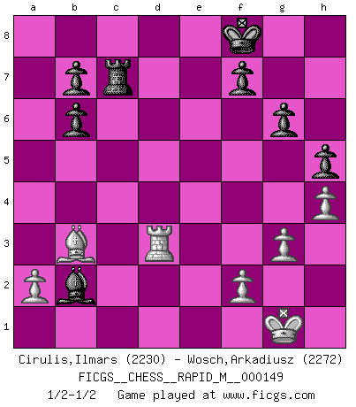 Last move : 1/2-1/2 2023 November 18 1:1:2 [Event "FICGS__CHESS__RAPID_M__000149"] [Site "FICGS"] [Date "2023.09.02"] [Round "1"] [White "Cirulis,Ilmars"] [Black "Wosch,Arkadiusz"] [Result "1/2-1/2"] [WhiteElo "2230"] [BlackElo "2272"] 1.e4 c5 2.c4 Nc6 3.Ne2 Nf6 4.Nbc3 e6 5.d4 d5 6.cxd5 exd5 7.Bg5 cxd4 8.Nxd5 Be7 9.Bxf6 Bxf6 10.g3 O-O 11.Bg2 g6 12.Nef4 Bg7 13.O-O Qd6 14.Rc1 Rd8 15.Nd3 Be6 16.h4 Rab8 17.Nc5 Bxd5 18.exd5 Ne5 19.Qb3 Qb6 20.Qxb6 axb6 21.Nb3 d3 22.Rc7 Kf8 23.Rd1 Rdc8 24.d6 Rxc7 25.dxc7 Rc8 26.Nc1 Rxc7 27.Nxd3 Nxd3 28.Rxd3 Bxb2 29.Bd5 h5 30.Bb3 1/2-1/2 Follow this game move after move (download)The boy (then a 12 year old boy named Anatoly Karpov) doesn't have a clue about Chess, and there's no future at all for him in this profession. (Mikhail Botvinnik) Das Schachspiel hat wie die Liebe, die Musik, die Fähigkeit, den Menschen glücklich zu machen. Ich habe ein leises Gefühl des Bedauerns für jeden, der das Schachspiel nicht kennt, so wie ich jeden bedaure, der die Liebe nicht kennt. (Siegbert Tarrasch) Coloca el contenido del tablero de Ajedrez en un sombrero, agita las piezas vigorosamente, derrámalas en el tablero desde una altura de medio metro y así obtienes el estilo de Wilhelm Steinitz. (H. E. Bird) On n'a jamais que l'âge auquel on a commence à jouer aux échecs car après on cesse de vieillir. (Capablanca) This is where the fun begins. (Anakin Skywalker in Star Wars ep.3)