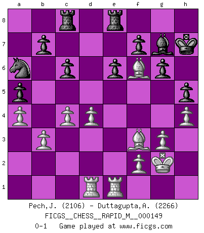 Last move : 0-1 2024 January 13 3:37:13 [Event "FICGS__CHESS__RAPID_M__000149"] [Site "FICGS"] [Date "2023.09.02"] [Round "1"] [White "Pech,Jaroslav"] [Black "Duttagupta,Aniruddha"] [Result "0-1"] [WhiteElo "2106"] [BlackElo "2266"] 1.e4 d5 2.exd5 Qxd5 3.Nc3 Qd6 4.d4 Nf6 5.Nf3 c6 6.Be2 Bg4 7.h3 Bxf3 8.Bxf3 e6 9.O-O Nbd7 10.Re1 Be7 11.g3 Qc7 12.b3 a5 13.Bb2 O-O 14.Rc1 Rfe8 15.Kg2 Rad8 16.Qe2 Bf8 17.Rcd1 g6 18.a4 h5 19.h4 Bh6 20.Ba3 Bf8 21.Bb2 Bh6 22.Ne4 Nxe4 23.Qxe4 Bg7 24.Bc1 Nf6 25.Qe5 Nd5 26.Qxc7 Nxc7 27.Bd2 Ra8 28.Bg5 Kh7 29.Kf1 Rac8 30.c4 Bh6 31.Kg2 Na6 32.Bf6 Bg7 0-1 Follow this game move after move (download)Chess is 99 percent tactics. (Teichmann) Mein erstes Ziel war nicht, die Partie zu gewinnen, sondern eine Figur zu opfern. -- der junge (Wilhelm Steinitz) Fischer era un maestro de claridad y un Rey del posicionamiento astuto. Sus oponentes podían ver hacia donde se dirigía pero eran impotentes para detenerlo. (Bruce Pandolfini) La vérité est comme le meilleur coup aux échecs : elle existe, mais il faut la chercher. (Arturo Perez-Reverte) Philosophers use a language that is already deformed as though by shoes that are too tight. (Ludwig Wittgenstein)