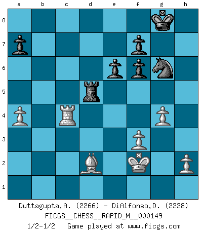 Last move : 1/2-1/2 2023 November 28 13:22:31 [Event "FICGS__CHESS__RAPID_M__000149"] [Site "FICGS"] [Date "2023.09.02"] [Round "1"] [White "Duttagupta,Aniruddha"] [Black "DiAlfonso,Darren"] [Result "1/2-1/2"] [WhiteElo "2266"] [BlackElo "2228"] 1.d4 d5 2.c4 c6 3.Nf3 Nf6 4.Nc3 e6 5.Bg5 Nbd7 6.e3 Qa5 7.cxd5 Nxd5 8.Qd2 Bb4 9.Rc1 h6 10.Bh4 c5 11.a3 Bxc3 12.bxc3 b6 13.c4 Qxd2+ 14.Nxd2 Ne7 15.f3 Ba6 16.Be2 cxd4 17.exd4 Rc8 18.Ne4 Nf5 19.Bf2 O-O 20.a4 Nf6 21.Nxf6+ gxf6 22.g4 Ne7 23.Be3 Rc6 24.Bxh6 Rfc8 25.c5 Bxe2 26.Kxe2 bxc5 27.dxc5 Rxc5 28.Rxc5 Rxc5 29.Rc1 Re5+ 30.Kf2 Ra5 31.Rc4 Ng6 32.Bd2 Rd5 1/2-1/2 Follow this game move after move (download)I give 98 percent of my mental energy to Chess. Others give only 2 percent. (Bobby Fischer) Schach ist wie eine schöne Frau, zu der wir ständig zurückkehren, gleichviel, wie oft sie uns zurückweist. (Anonymous) Dios mío, Bobby Fischer juega tan simple. (Alexei Suetin) Je ne suis pas le dernier à jouer lâchement des coups douteux pendant le zeïtnot de l'adversaire pour l'achever: en effet les coups qui font le plus peur sont ceux que l'on ne comprend pas. Je me fais souvent peur quand je joue. (Un professeur anonyme) Live, lose, and learn, by observing your opponent how to win. (Amber Steenbock)
