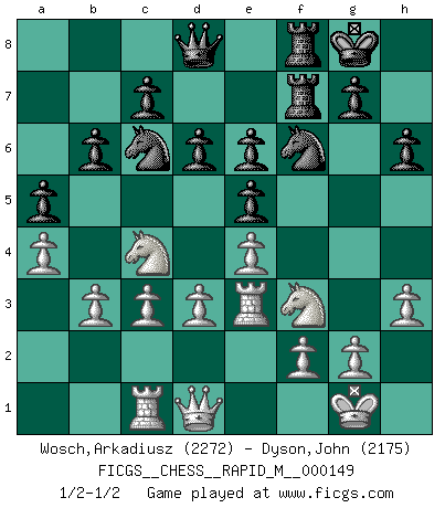 Last move : 1/2-1/2 2023 October 26 0:41:39 [Event "FICGS__CHESS__RAPID_M__000149"] [Site "FICGS"] [Date "2023.09.02"] [Round "1"] [White "Wosch,Arkadiusz"] [Black "Dyson,John"] [Result "1/2-1/2"] [WhiteElo "2272"] [BlackElo "2175"] 1.e4 e5 2.Nf3 Nc6 3.Bc4 Bc5 4.c3 Nf6 5.d3 a6 6.a4 d6 7.O-O h6 8.Re1 O-O 9.Nbd2 a5 10.Nb3 Bb6 11.h3 Be6 12.Bxe6 fxe6 13.Be3 Bxe3 14.Rxe3 Qd7 15.Nbd2 Rf7 16.Rb1 Raf8 17.Rc1 b6 18.b3 Qd8 19.Nc4 Nh7 20.Ncd2 Nf6 21.Nc4 1/2-1/2 Follow this game move after move (download)By playing at Chess then, we may learn: First: Foresight... Second: Circumspection... Third: Caution... And lastly, we learn by Chess the habit of not being discouraged by present bad appearances in the state of our affairs, the habit of hoping for a favorable chance, and that of persevering in the secrets of resources. (Benjamin Franklin) Es ist besser die Steine des Gegners zu opfern. (Savielly Grigorievitsch Tartakower) Me siento como si fuera una pieza en una partida de Ajedrez, cuando mi oponente me indica: esa pieza no puede ser movida. (Soren Kierkegaard) Si je n'étais pas joueur d'échecs, je serais le meilleur dans quelque chose d'autre. (Anatoli Karpov) Ah, the Socrating method. The best way we have of teaching everything-apart from juggling chainsaws. (Gregory House, House M.D.)