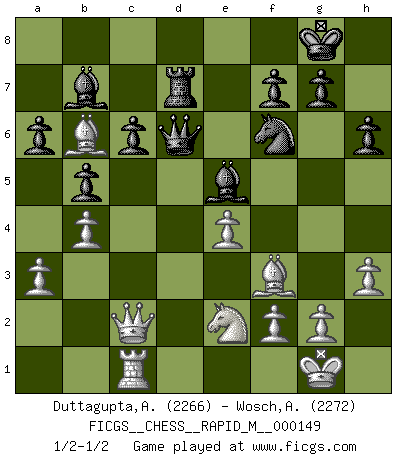 Last move : 1/2-1/2 2023 November 29 18:20:43 [Event "FICGS__CHESS__RAPID_M__000149"] [Site "FICGS"] [Date "2023.09.02"] [Round "1"] [White "Duttagupta,Aniruddha"] [Black "Wosch,Arkadiusz"] [Result "1/2-1/2"] [WhiteElo "2266"] [BlackElo "2272"] 1.d4 Nf6 2.c4 e6 3.Nf3 d5 4.Nc3 c6 5.e3 Nbd7 6.Qc2 Bd6 7.Bd3 O-O 8.O-O dxc4 9.Bxc4 a6 10.Rd1 b5 11.Be2 Qc7 12.e4 e5 13.dxe5 Nxe5 14.h3 Re8 15.Be3 Nxf3+ 16.Bxf3 h6 17.Rac1 Bb7 18.a3 Rad8 19.b4 Be5 20.Rxd8 Rxd8 21.Ne2 Qd6 22.Bb6 Rd7 23.Be3 Rd8 24.Bb6 Rd7 1/2-1/2 Follow this game move after move (download)The game of chess is the touchstone of the intellect. (Goethe) Wenn Spassky eine Figur opfert kannst du genauso gut aufgeben. Aber wenn Tal eine Figur opfert, spiel weiter. Er könnte noch eine weitere opfern, und dann ... wer weiß? (Miguel Najdorf) Todavía soy una víctima del Ajedrez. Tiene toda la belleza del arte y mucho mas. No puede ser comercializado. El Ajedrez es mas puro que el arte en su posición social. (Marcel Duchamp) J'apprécie les joueurs d'est-indienne, c'est grâce à eux que je nourris ma famille depuis tant d'années. (Petrosian) There are more things in heaven and earth than practically anywhere else. (Unknown)