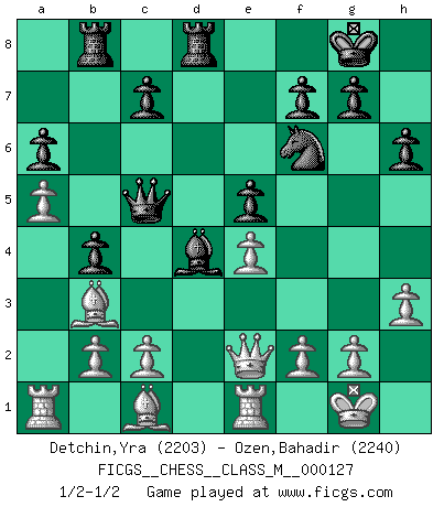 Last move : 1/2-1/2 2023 September 9 0:31:16 [Event "FICGS__CHESS__CLASS_M__000127"] [Site "FICGS"] [Date "2023.09.03"] [Round "1"] [White "Detchin,Yra"] [Black "Ozen,Bahadir"] [Result "1/2-1/2"] [WhiteElo "2203"] [BlackElo "2240"] 1.e4 e5 2.Nf3 Nc6 3.Bb5 a6 4.Ba4 Nf6 5.O-O Be7 6.Re1 b5 7.Bb3 O-O 8.a4 b4 9.d4 d6 10.dxe5 dxe5 11.Nbd2 Bc5 12.Qe2 Qe7 13.a5 Rd8 14.Bc4 Bg4 15.Qf1 h6 16.h3 Bxf3 17.Nxf3 Nd4 18.Nxd4 Bxd4 19.Qe2 Qc5 20.Bb3 Rab8 1/2-1/2 Follow this game move after move (download)Methodical thinking is of more use in Chess than inspiration. (C. J. S. Purdy) Nur ein wirklich starker Spieler weiß wie schwach er spielt. (Savielly Grigorievitsch Tartakower) El jugador táctico debe saber que hacer cuando algo se debe de hacer. El estratégico debe saber que hacer cuando nada se debe de hacer. (Savielly Tartakover) Les Echecs sont et restent toujours un combat, un combat intégral comme la boxe, la lutte ou un autre sport, et où il doit y avoir un vainqueur et un vaincu. (Joseph Emil Diemer) A good teacher is like a candle - it consumes itself to light the way for others. (Author unknown)
