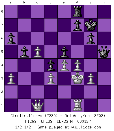 Last move : 1/2-1/2 2023 September 17 10:0:25 [Event "FICGS__CHESS__CLASS_M__000127"] [Site "FICGS"] [Date "2023.09.03"] [Round "1"] [White "Cirulis,Ilmars"] [Black "Detchin,Yra"] [Result "1/2-1/2"] [WhiteElo "2230"] [BlackElo "2203"] 1.d3 d5 2.Nf3 Nf6 3.g3 c5 4.Bg2 Nc6 5.Bf4 e6 6.O-O Bd6 7.Bxd6 Qxd6 8.Nbd2 e5 9.c3 O-O 10.e4 d4 11.Nc4 Qb8 12.cxd4 cxd4 13.Rc1 h6 14.a3 Be6 15.Nh4 Qd8 16.b4 a6 17.h3 b5 18.Nd2 Rc8 19.Nb3 Nd7 20.Nf5 Kh7 21.Nc5 Nxc5 22.Rxc5 g6 23.Nxh6 Kxh6 24.Qc1+ Kg7 25.Rxc6 Qd7 26.Rc5 Bxh3 27.f4 Qg4 28.Bxh3 Qxh3 29.Kf2 Rxc5 30.bxc5 Qh2+ 31.Kf3 Qh5+ 1/2-1/2 Follow this game move after move (download)I have always a slight feeling of pity for the man who has no knowledge of Chess. (Siegbert Tarrasch) Herr Iljumschinow ist ein etwas merkwürdiger Geschäftsmann: Er arbeitet zusammen mit Leuten wie Muammar al-Gaddafi; früher ist das Saddam Hussein gewesen. (Joel Lautier) El Jaque al descubierto es el bombardero del tablero. (Reuben Fine) Je ne crois pas en la psychologie, je crois aux bons coups. (Robert Fischer) Being number two sucks. (Andre Agassi)