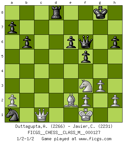 Last move : 1/2-1/2 2024 February 7 12:22:10 [Event "FICGS__CHESS__CLASS_M__000127"] [Site "FICGS"] [Date "2023.09.03"] [Round "1"] [White "Duttagupta,Aniruddha"] [Black "Javier,Christian"] [Result "1/2-1/2"] [WhiteElo "2266"] [BlackElo "2231"] 1.d4 Nf6 2.Bg5 d5 3.e3 c5 4.Bxf6 gxf6 5.dxc5 e6 6.Nf3 Bxc5 7.Be2 Nc6 8.O-O f5 9.c4 d4 10.b4 Bxb4 11.exd4 O-O 12.Qb3 Qf6 13.Rd1 Be7 14.Qe3 b6 15.Nc3 Bb7 16.d5 Nb4 17.d6 Bxd6 18.Rxd6 Nc2 19.Qc1 Nxa1 20.Nd5 Bxd5 21.cxd5 Rfd8 22.Rxd8+ Rxd8 23.dxe6 fxe6 24.g3 h6 25.Kf1 1/2-1/2 Follow this game move after move (download)I still hope to kill Fischer. (Boris Spassky) Die Arbeit ist etwas Unnatürliches. Die Faulheit allein ist göttlich. (Anatole France) Los Peones son nacidos libres, y aún así, se encuentran por doquier encadenados. (Rick Kennedy) Même si l'adversaire joue le coup analysé précédemment, recommencez l'analyse en voyant la nouvelle position. Première règle de Blumenfeld It's not a bug - it's an undocumented feature. (Anonymous)