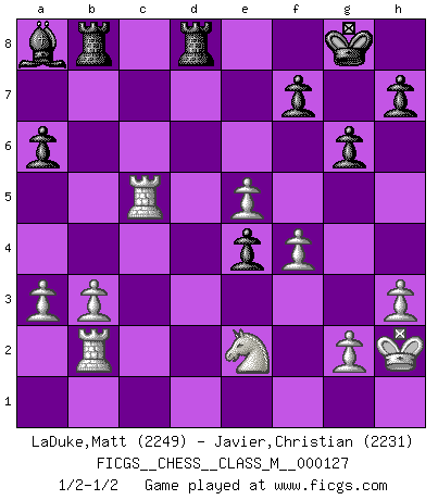 Last move : 1/2-1/2 2023 November 27 5:46:5 [Event "FICGS__CHESS__CLASS_M__000127"] [Site "FICGS"] [Date "2023.09.03"] [Round "1"] [White "LaDuke,Matt"] [Black "Javier,Christian"] [Result "1/2-1/2"] [WhiteElo "2249"] [BlackElo "2231"] 1.e4 c5 2.Nf3 Nc6 3.Bb5 e6 4.O-O Nge7 5.d4 cxd4 6.Nxd4 Qb6 7.Nxc6 bxc6 8.Be2 Ng6 9.c4 c5 10.Nc3 Be7 11.Rb1 O-O 12.Be3 Qc7 13.f4 Bb7 14.Bd3 d6 15.Qc2 a6 16.a3 Rfd8 17.h3 Rab8 18.Kh2 Bf6 19.Ne2 Nf8 20.Bd2 g6 21.b3 Nd7 22.Bc3 Ba8 23.Rb2 d5 24.Bxf6 Nxf6 25.cxd5 exd5 26.e5 Ne4 27.Rc1 Qa5 28.Bxe4 dxe4 29.Qxc5 Qxc5 30.Rxc5 1/2-1/2 Follow this game move after move (download)I have added these principles to the law: get the Knights into action before both Bishops are developed. (Emanuel Lasker) Heutzutage gewinnt im Turnier nicht derjenige Spieler, der weitreichende Pläne entwirft, sondern einfach jener, der Zug um Zug kämpft. (David Bronstein) El Ajedrez lo es todo: arte, ciencia y deporte. (Anatoly Karpov) Echiquier : carré parfait, comme la Jérusalem nouvelle décrite par l'auteur de l'Apocalypse, huit cases sur huit, exaltation du chiffre 4, symbole du cosmos aux quatre horizons... où le noir et le blanc, l'ombre et la lumière, le mal et le bien s'entremêlent et se conjuguent. (Robert Couffignal, Le Gambit du poète) Warrior pose battles inner weakness and wins focus. You see that there is no war within you. You're on your own side, and you are your own strength. (Terri Guillemets)
