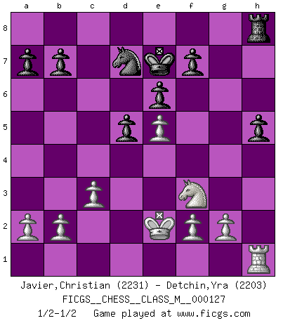 Last move : 1/2-1/2 2023 November 10 13:54:10 [Event "FICGS__CHESS__CLASS_M__000127"] [Site "FICGS"] [Date "2023.09.03"] [Round "1"] [White "Javier,Christian"] [Black "Detchin,Yra"] [Result "1/2-1/2"] [WhiteElo "2231"] [BlackElo "2203"] 1.d4 Nf6 2.Nf3 e6 3.Bf4 d5 4.e3 c5 5.Nbd2 Qb6 6.Rb1 cxd4 7.exd4 Bd7 8.c3 Bb5 9.h4 Nbd7 10.Bxb5 Qxb5 11.h5 h6 12.Ne5 Nxe5 13.dxe5 Nd7 14.Rh3 Be7 15.Rg3 Bg5 16.Bxg5 hxg5 17.Rxg5 g6 18.Qe2 Qxe2+ 19.Kxe2 Rxh5 20.Rxh5 gxh5 21.Nf3 Ke7 22.Rh1 Rh8 1/2-1/2 Follow this game move after move (download)Avoid the crowd. Do your own thinking independently. Be the Chess player, not the Chess piece. (Ralph Charell) Drei Punkte vor allen anderen ist wie einer, der im weißen Anzug posiert, während der Rest in Müllsäcke gekleidet dasteht. (Viktor Kortschnoi) Todo lo que importa ante el tablero de Ajedrez son buenas jugadas. (Bobby Fischer) Il n'y a pas eu de défaite parce que je ne crois pas que cet ordinateur ait jamais existé. IBM a triché en refusant d'imprimer les modes de recherche de la machine. C'est évident, pendant le match, des coups décisifs ont été joués par des êtres humains. Aujourd'hui, les meilleurs spécialistes en informatique ne peuvent toujours pas expliquer comment Deep-Blue a pu jouer contre la logique des ordinateurs. IBM a gagné une guerre de communication, mais ils sont incapables de prouver que l'ordinateur a gagné tout seul. (Garry Kasparov) Life is like internet, nothing interesting, but noone want to leave it. (Ilmars Cirulis)