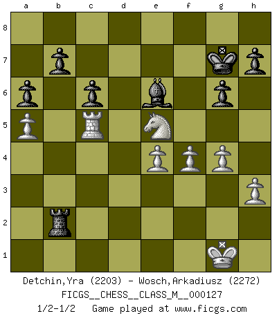 Last move : 1/2-1/2 2023 December 7 12:33:6 [Event "FICGS__CHESS__CLASS_M__000127"] [Site "FICGS"] [Date "2023.09.03"] [Round "1"] [White "Detchin,Yra"] [Black "Wosch,Arkadiusz"] [Result "1/2-1/2"] [WhiteElo "2203"] [BlackElo "2272"] 1.e4 c5 2.Nf3 Nc6 3.Bb5 g6 4.O-O Bg7 5.Re1 e5 6.Bxc6 dxc6 7.a4 Qe7 8.Na3 f6 9.c3 Be6 10.Qe2 Nh6 11.d4 cxd4 12.cxd4 exd4 13.Nc2 d3 14.Qxd3 O-O 15.Ncd4 Nf7 16.Bf4 Rad8 17.Qc2 Bc8 18.h3 Ne5 19.Rad1 Rfe8 20.a5 a6 21.Bxe5 fxe5 22.Nb3 Rxd1 23.Rxd1 Bf8 24.Rc1 Qb4 25.Nc5 Rd8 26.Nxe5 Kg7 27.g4 Rd2 28.Qc4 Bxc5 29.Qxc5 Qxc5 30.Rxc5 Rxb2 31.f4 Be6 1/2-1/2 Follow this game move after move (download)Chess, like any creative activity, can exist only through the combined efforts of those who have creative talent, and those who have the ability to organize their creative work. (Mikhail Botvinnik) Jeder Fehler erscheint unglaublich dumm, wenn andre ihn begehen. (Georg Christoph Lichtenberg) Un mal día en el Ajedrez, es mejor que cualquier buen día en el trabajo. (Anonymous) L'attaque fait le spectacle, la défense gagne les matchs. (Dicton footballistique) History is a gallery of pictures in which there are few originals and many copies. (Alexis de Tocqueville)
