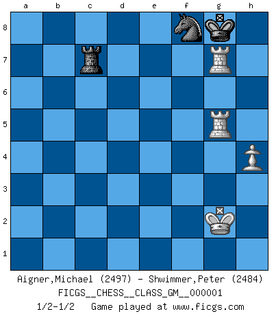 Last move : 1/2-1/2 2008 March 9 21:16:5 [Event "FICGS__CHESS__CLASS_GM__000001"] [Site "FICGS"] [Date "2007.09.06"] [Round "1"] [White "Aigner,Michael"] [Black "Shwimmer,Peter"] [Result "1/2-1/2"] [WhiteElo "2497"] [BlackElo "2484"] 1.e4 c5 2.Nf3 d6 3.d4 cxd4 4.Nxd4 Nf6 5.Nc3 a6 6.Be3 e5 7.Nb3 Be6 8.f3 Be7 9.Qd2 h5 10.Be2 Nbd7 11.Nd5 Nxd5 12.exd5 Bf5 13.Na5 Qc7 14.c4 O-O 15.b4 Rfe8 16.O-O h4 17.Rac1 Nf6 18.Rfd1 h3 19.g4 Bd7 20.c5 Ba4 21.Re1 dxc5 22.g5 Nh7 23.g6 fxg6 24.bxc5 Qd7 25.Nc4 Bd8 26.Rb1 Bb5 27.a4 Bxc4 28.Bxc4 Kh8 29.c6 bxc6 30.dxc6 Qxc6 31.Bd5 Qxa4 32.Ra1 Qd7 33.Bxa8 Qxd2 34.Bxd2 Bb6+ 35.Be3 Bxe3+ 36.Rxe3 Rxa8 37.Rxe5 Rc8 38.Rxa6 Nf6 39.Ra4 Kg8 40.Rh4 Rc1+ 41.Kf2 Nh5 42.R5e4 Rc2+ 43.Re2 Rc8 44.Ra2 Rb8 45.Rxh3 Nf4 46.Rg3 g5 47.Rg4 Rb3 48.h4 Nd3+ 49.Kg3 Ne5 50.Rxg5 Nxf3 51.Rga5 Ne5 52.Kg2 Nd7 53.Rg5 Rb7 54.Ra6 Rc7 55.Rag6 Nf8 56.Rxg7+ 1/2-1/2 Sicilian : Najdorf, Byrne (English) attack Kingside Castling by player Black (move 14) Kingside Castling by player White (move 16) 10 pieces endgame at move 45 : White KRRPP , Black KRNPP WHITE : King + 2 Rooks 2 Pawns BLACK : King + 1 Rook 1 Knight 2 Pawns 9 pieces endgame at move 50 : White KRRPP , Black KRNP WHITE : King + 2 Rooks 2 Pawns BLACK : King + 1 Rook 1 Knight 1 Pawn 8 pieces endgame at move 50 : White KRRP , Black KRNP WHITE : King + 2 Rooks 1 Pawn BLACK : King + 1 Rook 1 Knight 1 Pawn 7 pieces endgame at move 56 : White KRRP , Black KRN WHITE : King + 2 Rooks 1 Pawn BLACK : King + 1 Rook 1 Knight This chess game ended in a draw. Follow this game move after move (download)When you play Bobby, it is not a question if you win or lose. It is a question if you survive. (Boris Spassky) Wenn Capablanka heute auf der Schachbühne erscheinen würde, hätte er ein halbes Jahr gebraucht um sich die Schachtheorie anzueignen. Und dann hätte er alles und jeden besiegt. (Mikhail Moiseyevich Botvinik) Cuando estes solo, cuando te sientas un extraño en el mundo, juega al Ajedrez. Esto levantará tu espiritu y será tu consejero de guerra. (Aristóteles) Je ne crois pas en la psychologie, je crois aux bons coups. (Robert Fischer) Two beer, or not two beer. (Unknown)