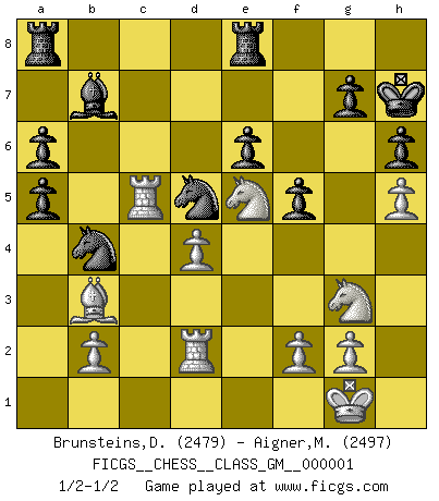 Last move : 1/2-1/2 2008 March 26 3:12:10 [Event "FICGS__CHESS__CLASS_GM__000001"] [Site "FICGS"] [Date "2007.09.06"] [Round "1"] [White "Brunsteins,Daniel"] [Black "Aigner,Michael"] [Result "1/2-1/2"] [WhiteElo "2479"] [BlackElo "2497"] 1.d4 d5 2.c4 dxc4 3.Nf3 Nf6 4.e3 e6 5.Bxc4 c5 6.O-O a6 7.a4 Nc6 8.Qe2 cxd4 9.Rd1 Be7 10.exd4 O-O 11.Nc3 Nd5 12.Bb3 Re8 13.h4 h6 14.Bc2 Bf8 15.Qd3 Nf6 16.Ne4 Nd5 17.Ng3 f5 18.Bb3 Ncb4 19.Qe2 b6 20.Bd2 Bb7 21.Rac1 Bd6 22.h5 Bf4 23.Ne5 Qg5 24.a5 bxa5 25.Rc5 Bxd2 26.Qxd2 Qxd2 27.Rxd2 Kh7 1/2-1/2 QGA : Classical, Rubinstein variation Kingside Castling by player White (move 6) Kingside Castling by player Black (move 10) This chess game ended in a draw. Follow this game move after move (download)Chess is so inspiring that I do not believe a good player is capable of having an evil thought during the game. (Wilhelm Steinitz) Matt entspricht nicht immer den Tatsachen. (Savielly Grigorievitsch Tartakower) Una victoria por una combinación errónea, aunque sea espectacular, me llena de horror artístico. (Wilhelm Steinitz) Un millionnaire : 'Monsieur Steinitz ! Vous ne participez aux tournois que pour l'argent, alors que moi je n'y viens que pour l'honneur.' Steinitz : 'Chacun joue pour ce qu'il n'a pas'... Have no fear of perfection - you'll never reach it. (Salvador Dali)