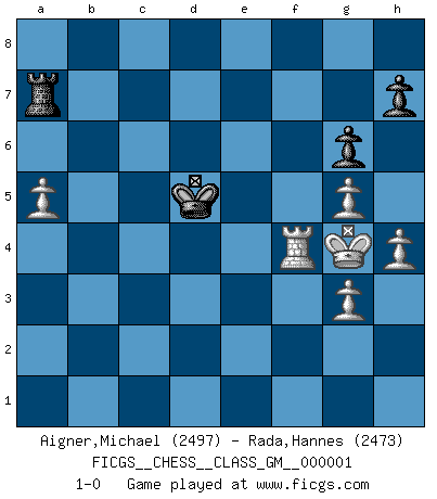 Last move : 1-0 2008 July 21 23:4:0 [Event "FICGS__CHESS__CLASS_GM__000001"] [Site "FICGS"] [Date "2007.09.06"] [Round "1"] [White "Aigner,Michael"] [Black "Rada,Hannes"] [Result "1-0"] [WhiteElo "2497"] [BlackElo "2473"] 1.d4 Nf6 2.c4 g6 3.Nc3 d5 4.cxd5 Nxd5 5.e4 Nxc3 6.bxc3 Bg7 7.Bc4 c5 8.Ne2 Nc6 9.Be3 O-O 10.O-O Bg4 11.f3 Na5 12.Bxf7+ Rxf7 13.fxg4 Rxf1+ 14.Kxf1 Qd6 15.Kg1 Qe6 16.Qd3 Qc4 17.Qxc4+ Nxc4 18.Bf2 cxd4 19.cxd4 e5 20.d5 Nd6 21.Ng3 Bh6 22.h4 Bf4 23.Bc5 Nc4 24.Nf1 b6 25.Bb4 Rc8 26.Rb1 Bh6 27.g5 Bf8 28.Nh2 Bxb4 29.Rxb4 Kf8 30.Ng4 Ke7 31.a4 Kd6 32.Nf6 a6 33.g3 Kc5 34.Rb1 Rh8 35.Nd7+ Kd4 36.Nxb6 Nd6 37.Nd7 Kxe4 38.Rb6 Kxd5 39.Nf6+ Kc5 40.Rxa6 e4 41.Ra5+ Kc4 42.Re5 Rb8 43.Re6 Rb1+ 44.Kh2 Kc5 45.Nxe4+ Nxe4 46.Rxe4 Rb2+ 47.Kh3 Rb7 48.Kg4 Kd5 49.Rf4 Ra7 50.a5 1-0 King's Indian defense, 3.Nc3 Kingside Castling by player Black (move 9) Kingside Castling by player White (move 10) 10 pieces endgame at move 46 : White KRPPPP , Black KRPP WHITE : King + 1 Rook 4 Pawns BLACK : King + 1 Rook 2 Pawns Player White won this chess game. Follow this game move after move (download)Chess, like love, is infectious at any age. (Flohr) Mein erstes Ziel war nicht, die Partie zu gewinnen, sondern eine Figur zu opfern. -- der junge (Wilhelm Steinitz) Observen a Garry Kasparov. Después de una derrota, invariablemente el gana la próxima partida. Prácticamente hace pedazos a su siguiente oponente. Eso es algo que tenemos que aprender a lograr. (Maurice Ashley) Je menace de comprendre la position. (Anonyme) The good fighters of old first put themselves beyond the possibility of defeat, and then waited for an opportunity of defeating the enemy. (Sun Tzu)