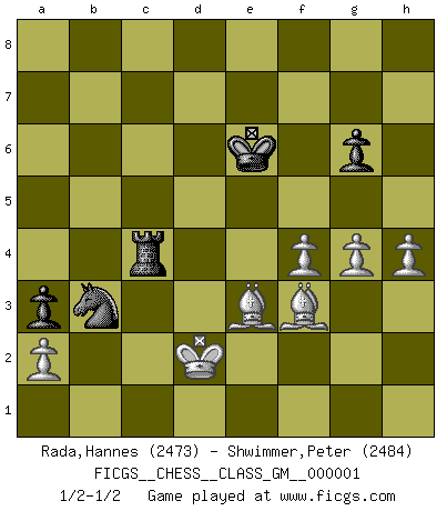 Last move : 1/2-1/2 2008 April 27 9:34:36 [Event "FICGS__CHESS__CLASS_GM__000001"] [Site "FICGS"] [Date "2007.09.06"] [Round "1"] [White "Rada,Hannes"] [Black "Shwimmer,Peter"] [Result "1/2-1/2"] [WhiteElo "2473"] [BlackElo "2484"] 1.Nf3 d5 2.d4 Nf6 3.c4 dxc4 4.e3 Be6 5.Nc3 c6 6.Ng5 Bd5 7.e4 h6 8.exd5 hxg5 9.dxc6 Nxc6 10.d5 Ne5 11.Qd4 Nfd7 12.Bxg5 Qb6 13.Be3 Qxb2 14.Rb1 Qc2 15.Rxb7 e6 16.dxe6 fxe6 17.f4 Bc5 18.Qd2 Qxd2+ 19.Bxd2 Nf7 20.Ne4 Bb6 21.Bxc4 Nd8 22.Rxb6 Nxb6 23.Bb5+ Kf8 24.O-O Nf7 25.Nc5 Nd6 26.Bc6 Rc8 27.Nxe6+ Kf7 28.Ng5+ Kg6 29.Bf3 Nbc4 30.Bc1 Kf6 31.g4 g6 32.Rd1 Rhd8 33.Be2 Nf7 34.Ne4+ Kg7 35.Kf2 Rxd1 36.Bxd1 Nd8 37.Nd2 Ne6 38.Nxc4 Rxc4 39.Bd2 Nc5 40.Be3 a5 41.Ke2 Kf7 42.h4 Kf6 43.Bd2 a4 44.Be3 a3 45.Kd2 Ke6 46.Bf3 Nb3+ 1/2-1/2 Reti Opening Kingside Castling by player White (move 24) This chess game ended in a draw. Follow this game move after move (download)Live, lose, and learn, by observing your opponent how to win. (Amber Steenbock) Die meiste Zeit treffe ich auf Gegner, die meine Enkel sein könnten. Ich bin da, um ihnen zu zeigen, dass sie von mir noch einiges lernen können. (Viktor Kortschnoi) Combinaciones deslumbrantes son para la mayoría, mover madera es para los pocos. (Georg Kieninger) On a dit que l'homme se distingue de l'animal par le fait qu'il achète plus de livres qu'il ne peut en lire. Je voudrais suggérer qu'inclure à la liste des livres quelques livres d'échecs rendrait la distinction manifeste. (Edward Lasker) I fear not the man who has practiced 10,000 kicks once, but I fear the man who has practiced one kick 10,000 times. (Bruce Lee)