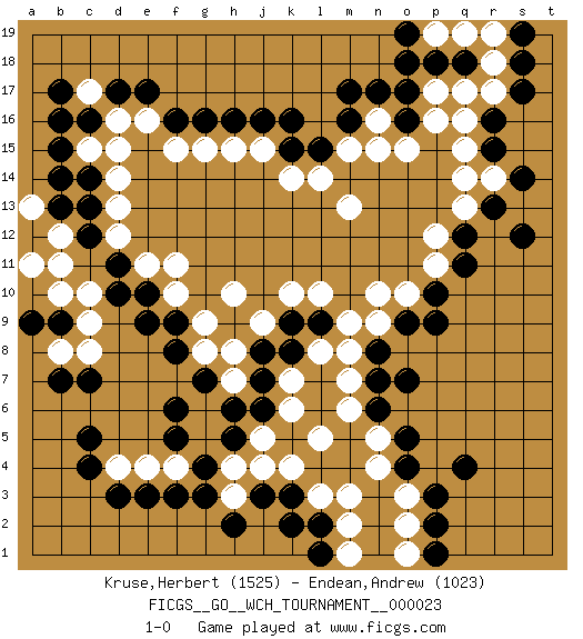 Last move : 1-0 2024 January 24 20:17:20 [Event "FICGS__GO__WCH_TOURNAMENT__000023"] [Site "FICGS"] [Date "2023.09.04"] [Round "1"] [Black "Kruse,Herbert"] [White "Endean,Andrew"] [Result "1-0"] [Rating 1 "1525"] [Rating 2 "1023"] 1.c16 e16 2.e17 d16 3.d17 c15 4.f16 c17 5.b16 f15 6.g16 g15 7.h16 h15 8.b15 d14 9.c13 d13 10.j16 j15 11.c12 d12 12.k15 k14 13.l15 l14 14.d11 e11 15.e10 f11 16.c4 e4 17.e3 d4 18.d3 f4 19.c5 k4 20.q4 q16 21.f3 o3 22.d10 f10 23.r16 r17 24.r15 q15 25.s17 r18 26.r13 q13 27.q12 q14 28.s12 r14 29.s14 p12 30.q11 p11 31.p10 o10 32.o9 n10 33.p9 n9 34.m17 m15 35.g4 g5 36.h5 h4 37.g3 j5 38.h6 g6 39.g7 h7 40.j6 k6 41.j7 h8 42.f6 k7 43.j8 j9 44.k8 l8 45.k9 k10 46.l9 l10 47.f5 h10 48.o4 n4 49.o5 n5 50.p3 o2 51.p2 m3 52.o7 m8 53.o17 p17 54.o16 o15 55.m16 n16 56.n17 n15 57.f9 g9 58.f8 g8 59.p18 p16 60.q18 q17 61.j3 j4 62.k3 l3 63.n6 m6 64.s18 r19 65.k16 m13 66.l2 m2 67.k2 h3 68.h2 m9 69.p1 o1 70.n8 m7 71.n7 l5 72.c14 d15 73.l1 m1 74.s19 q19 75.o19 p19 76.o18 c9 77.b17 b11 78.b7 c8 79.e9 c10 80.b14 b12 81.a12 a11 82.c7 a13 83.b9 b10 84.b13 b8 85.a9 1-0 Follow this game move after move (download)Fighting must not be the key to go, it should be reserved as your last resource. (Zhong-Pu Liu, about Weiqi) If you know the enemy and know yourself you need not fear the results of a hundred battles. (Sun Tzu)