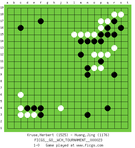 Last move : 1-0 2023 December 3 19:59:47 [Event "FICGS__GO__WCH_TOURNAMENT__000023"] [Site "FICGS"] [Date "2023.10.04"] [Round "1"] [Black "Kruse,Herbert"] [White "Huang,Jing"] [Result "1-0"] [Rating 1 "1525"] [Rating 2 "1176"] 1.c16 c4 2.q4 q17 3.e4 e3 4.f3 d3 5.f4 c6 6.r15 p16 7.f17 j4 8.n3 r13 9.p15 o15 10.p14 q12 11.q16 r16 12.q15 p17 13.r17 r18 14.s16 s18 15.o14 n15 16.r9 o12 17.n14 m15 18.m14 l15 19.p11 p12 20.m12 p10 21.n10 o10 22.d4 c3 23.n9 1-0 This go game has been lost on time (started : 2023.10.04 17:49:24) Follow this game move after move (download)The comb formation is alive. (Anonymous) He who fights with monsters should be careful lest he thereby become a monster. (Friedrich Nietzsche, Beyond Good and Evil)