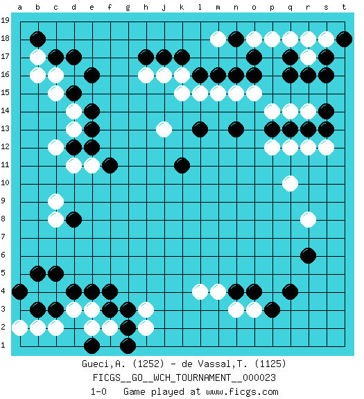 Last move : 1-0 2024 February 15 2:25:53 [Event "FICGS__GO__WCH_TOURNAMENT__000023"] [Site "FICGS"] [Date "2023.09.04"] [Round "1"] [Black "Gueci,Alberto"] [White "de Vassal,Thibault"] [Result "1-0"] [Rating 1 "1252"] [Rating 2 "1125"] 1.q16 c16 2.q4 d3 3.e16 h16 4.c17 b17 5.d17 d14 6.e14 d13 7.b18 b16 8.e13 d11 9.k17 k16 10.l16 k15 11.j17 j16 12.d15 c15 13.h17 l15 14.c5 c8 15.m16 m15 16.o16 r17 17.r16 q18 18.d8 c9 19.e4 e3 20.f4 c4 21.d12 c12 22.e12 e11 23.d4 b4 24.b5 o15 25.f3 l4 26.f11 o3 27.s17 s18 28.q17 r18 29.s16 o18 30.o17 p18 31.l13 p14 32.n16 n15 33.t18 m18 34.n18 r14 35.o4 n3 36.p3 h3 37.n4 m4 38.c3 c2 39.b3 b2 40.a4 f2 41.g2 e2 42.g3 a2 43.g1 h2 44.e1 q10 45.r6 r8 46.q13 q14 47.r13 p12 48.s14 s12 49.s13 r12 50.p13 q12 51.n13 j13 52.k11 1-0 Follow this game move after move (download)A meijin needs no joseki. (Anonymous) A good player is always lucky. (Capablanca)