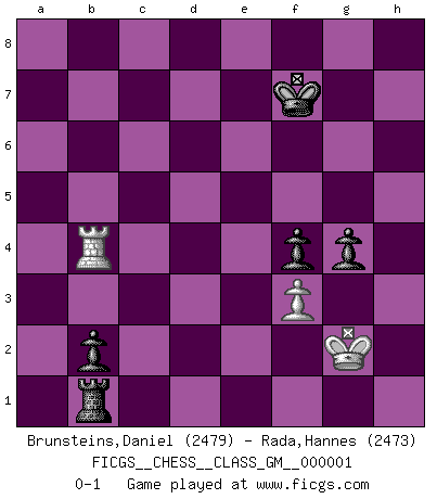 Last move : 0-1 2009 January 2 9:35:4 [Event "FICGS__CHESS__CLASS_GM__000001"] [Site "FICGS"] [Date "2007.09.06"] [Round "1"] [White "Brunsteins,Daniel"] [Black "Rada,Hannes"] [Result "0-1"] [WhiteElo "2479"] [BlackElo "2473"] 1.d4 Nf6 2.c4 e6 3.Nf3 d5 4.Nc3 c6 5.e3 Nbd7 6.Bd3 dxc4 7.Bxc4 b5 8.Bd3 Bd6 9.O-O O-O 10.a3 Bb7 11.Bd2 Qe7 12.Ng5 b4 13.axb4 Bxb4 14.e4 e5 15.Ne2 h6 16.Nf3 c5 17.Bxb4 cxb4 18.Ng3 exd4 19.Qd2 Qc5 20.Qf4 Rfe8 21.Rac1 Qb6 22.e5 Nd5 23.Qf5 Nf8 24.Rfe1 Ne7 25.Qg4 Qe6 26.Qxd4 Bxf3 27.gxf3 Nc6 28.Rxc6 Qxc6 29.Be4 Qd7 30.Qxd7 Nxd7 31.Bxa8 Rxa8 32.Nf5 a5 33.Re4 b3 34.Nd6 a4 35.Nc4 Nc5 36.Rd4 Ne6 37.Rd1 Rb8 38.Kf1 Rb4 39.Ne3 Nf4 40.Ng2 Ng6 41.f4 Nxf4 42.Nxf4 Rxf4 43.Rd7 Rh4 44.Kg2 Re4 45.Kf3 Rxe5 46.Ra7 Rc5 47.Rxa4 Rc2 48.Rb4 Rxb2 49.Rb7 g5 50.h3 Kg7 51.Rb5 Rb1 52.Kg4 Kg6 53.Rb6+ f6 54.Kg3 b2 55.Kg2 h5 56.Rb4 f5 57.Rb6+ Kf7 58.f3 f4 59.Rb4 g4 60.hxg4 hxg4 0-1 Comment by player 2 : Hannes Rada : White delayed the resignation from Dec 5h until January 2nd. Wonderful example of DMD ..... Queen's pawn game Kingside Castling by player White (move 9) Kingside Castling by player Black (move 9) 10 pieces endgame at move 48 : White KRPP , Black KRPPPP WHITE : King + 1 Rook 2 Pawns BLACK : King + 1 Rook 4 Pawns 9 pieces endgame at move 60 : White KRPP , Black KRPPP WHITE : King + 1 Rook 2 Pawns BLACK : King + 1 Rook 3 Pawns 8 pieces endgame at move 60 : White KRP , Black KRPPP WHITE : King + 1 Rook 1 Pawn BLACK : King + 1 Rook 3 Pawns Player Black won this chess game. Follow this game move after move (download)When you are lonely, when you feel yourself an alien in the world, play Chess. This will raise your spirits and be your counselor in war. (Aristotle) Schach ist wie eine schöne Frau, zu der wir ständig zurückkehren, gleichviel, wie oft sie uns zurückweist. (Anonymous) Tu no necesitas jugar muy bien, únicamente ayudar a tu oponenet a que juegue muy mal. (Genrikh Chepukaitis) Plusieurs personnes se sont demandées comment Tal faisait pour gagner... En fait, c'est très simple ! Il met ses pièces au centre de l'échiquier et les sacrifie quelque part ! (David Bronstein) Memory... is the diary that we all carry with us. (Oscar Wilde, The Importance of Being Earnest)