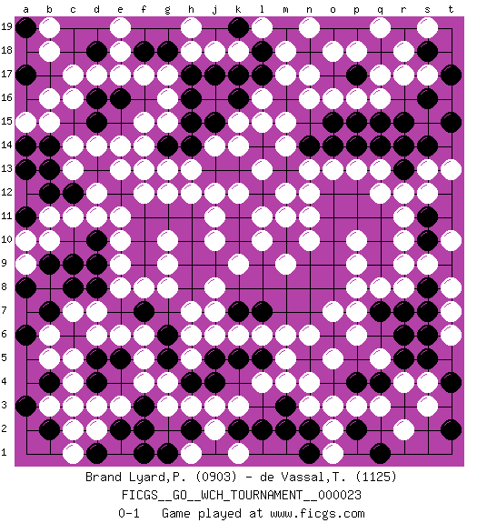 Last move : 0-1 2024 May 22 8:3:23 [Event "FICGS__GO__WCH_TOURNAMENT__000023"] [Site "FICGS"] [Date "2023.09.04"] [Round "1"] [Black "Brand Lyard,Paul"] [White "de Vassal,Thibault"] [Result "0-1"] [Rating 1 "0903"] [Rating 2 "1125"] 1.a19 c17 2.f9 c3 3.h16 d14 4.l12 q16 5.b7 c11 6.k7 f4 7.r7 q3 8.f19 n4 9.s18 r17 10.a13 b10 11.q11 q13 12.j4 h3 13.a17 b16 14.l17 n17 15.e15 f13 16.s14 r12 17.h10 f17 18.o10 k3 19.m8 n13 20.j13 f15 21.k10 d7 22.g6 p6 23.f11 e9 24.k19 e11 25.p19 o18 26.l15 m15 27.b14 c14 28.m10 m6 29.j15 h18 30.d19 q8 31.m19 m18 32.o9 r9 33.l14 m14 34.g14 g13 35.c6 f6 36.s16 s17 37.h14 l16 38.d18 l13 39.c12 h12 40.k11 k14 41.k13 k15 42.d16 d17 43.f16 g17 44.h17 j18 45.o11 f14 46.c15 b15 47.b13 d12 48.k8 j12 49.d5 c4 50.h8 k12 51.h9 m12 52.d13 e13 53.o14 o13 54.k5 l4 55.f7 e6 56.l9 k6 57.f10 j6 58.g11 e8 59.j9 h7 60.b9 b5 61.o15 f8 62.e2 g8 63.o6 o7 64.c8 c7 65.m16 m17 66.g5 g4 67.l7 l6 68.f1 d2 69.n2 o3 70.p12 p13 71.m3 m4 72.q15 o16 73.l8 l11 74.n8 n11 75.n5 n6 76.o8 p8 77.s11 r11 78.f3 e3 79.f2 n10 80.r5 r4 81.r3 s3 82.e12 f12 83.f18 e17 84.q14 s13 85.h11 j11 86.q4 r2 87.q10 l10 88.q9 j10 89.p2 p3 90.k2 j2 91.p17 p16 92.k16 n16 93.l2 o2 94.s8 s9 95.r15 p9 96.e5 f5 97.c9 b6 98.s6 q5 99.q18 p18 100.a11 b11 101.t15 p10 102.e16 g16 103.p4 o5 104.r6 r8 105.d10 d11 106.b2 c2 107.q7 p7 108.n7 g9 109.o19 r18 110.s10 t10 111.d1 c1 112.h2 j3 113.r13 s12 114.g18 e18 115.j17 k18 116.j5 h6 117.o12 j7 118.c18 b18 119.s5 t8 120.a8 a10 121.p14 r10 122.d4 d3 123.n1 o1 124.q1 k1 125.h15 g15 126.n9 m11 127.l5 m5 128.g19 e19 129.g1 g3 130.d8 e10 131.b4 c5 132.t4 s4 133.b12 c13 134.s7 t7 135.n14 q12 136.a3 b3 137.p11 j8 138.h4 h5 139.a6 d6 140.r19 q17 141.k17 h19 142.g18 h13 143.n18 n19 144.p15 t13 145.m2 n3 146.l18 l19 147.l14 l15 148.c19 b19 149.d15 e14 150.d18 c16 151.m7 n12 152.t17 q19 153.d9 a9 154.d15 g12 155.d16 k9 156.r14 s19 157.f18 m9 158.a14 a15 159.e16 j14 160.t2 t6 161.j1 h1 162.k7 pass 163.l7 g10 0-1 Follow this game move after move (download)Ikken tobi is never wrong. (Anonymous) To err is human, to shift the blame on someone else is tactical. (Mladen Jankovic)