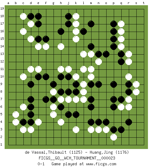 Last move : 0-1 2024 April 18 2:57:4 [Event "FICGS__GO__WCH_TOURNAMENT__000023"] [Site "FICGS"] [Date "2023.10.04"] [Round "1"] [Black "de Vassal,Thibault"] [White "Huang,Jing"] [Result "0-1"] [Rating 1 "1125"] [Rating 2 "1176"] 1.c4 q16 2.r4 c16 3.e17 d15 4.h16 k17 5.m17 k15 6.l16 k16 7.p17 q17 8.p16 q15 9.p15 q14 10.p14 h14 11.j18 k18 12.j17 d17 13.e18 e4 14.d7 c3 15.d4 d3 16.m4 c6 17.d6 b4 18.d5 b5 19.d9 d11 20.e10 e11 21.f10 l13 22.m14 m13 23.n13 n12 24.o13 m11 25.q13 r13 26.f15 f14 27.d18 c18 28.q12 r12 29.r8 k3 30.k5 m3 31.n4 n3 32.o4 o3 33.p3 p2 34.q3 h4 35.m9 r10 36.p9 s8 37.r9 s9 38.h6 l9 39.l10 m10 40.k9 l8 41.j10 l11 42.n9 k10 43.k8 j11 44.h10 h11 45.m7 l7 46.m6 k7 47.j8 j7 48.h8 h7 49.g7 g8 50.g9 g6 51.f7 g5 52.j5 r7 53.q7 q6 54.p7 r6 55.p6 c10 56.e15 e14 0-1 Follow this game move after move (download)With only one group, you will win. (Anonymous) He is a liar. I just don't know what the lie is yet. (Horatio Caine, C.S.I. Miami)