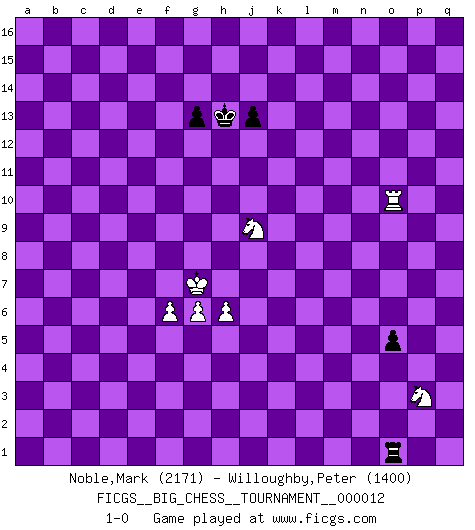 Last move : 1-0 2007 November 12 20:8:33 [Event "FICGS__BIG_CHESS__TOURNAMENT__000012"] [Site "FICGS"] [Date "2007.09.08"] [Round "1"] [White "Noble,Mark"] [Black "Willoughby,Peter"] [Result "1-0"] [WhiteElo "2171"] [BlackElo "1400"] 1.j2-k4 h15-g13 2.h1-o7 o15-o14 3.o7-c7 j15-k13 4.c7-c15 b16-c14 5.c15-p3 p15-p14 6.h2-g4 d15-d13 7.e2-e4 e15-e13 8.f1-c4 n15-n13 9.n2-n4 m15-m13 10.o1-g8 p16-n15 11.d2-d3 l16-n14 12.m2-m4 l15-l13 13.l1-o4 l13-l12 14.c1-k8 n15-l14 15.k8-e13 c14-e13 16.o4-e13 g13-f11 17.e13-j9 g16-f14 18.k1-h2 f14-g12 19.p1-n2 o16-h10 20.b1-d2 h10-j9 21.p3-j9 k13-j11 22.g1-j2 h16-m12 23.j9-m12 l14-m12 24.f2-f4 g12-h10 25.g8-d5 f16-d14 26.d2-f3 c16-p4 27.o2-o3 p4-f13 28.l2-l4 m16-m14 29.n2-l3 e16-e12 30.k4-m5 e12-k12 31.k2-k4 k12-k10 32.h2-k3 k10-q10 33.j1-h2 h10-k9 34.q2-q3 q10-p10 35.m1-m2 m14-k14 36.g4-j5 k14-k10 37.g2-g4 p10-p13 38.m5-n3 k16-l14 39.n3-o5 k10-p10 40.p2-p4 j16-j15 41.l4-l5 q16-e16 42.m4-m5 a16-c16 43.h3-h4 k15-k13 44.g4-g5 k13-k12 45.f4-f5 k12-k11 46.j2-g3 n14-p12 47.e1-f1 d14-j9 48.c2-c3 f13-j10 49.q3-q4 j10-d5 50.c4-d5 c16-c12 51.h4-h5 k9-j7 52.j3-j4 e16-e12 53.k3-h4 b15-b13 54.j5-g4 a15-a13 55.m5-m6 j7-l6 56.f1-k1 l6-n5 57.q1-o1 n5-l4 58.m2-m4 l4-n5 59.l3-m5 n5-p6 60.q4-q5 p6-q8 61.m5-n7 j14-j13 62.d5-b3 f15-f13 63.d3-d4 p12-n14 64.e4-e5 k11-k10 65.f5-f6 m12-k11 66.g4-h6 k11-l9 67.g5-g6 m13-m12 68.g3-f5 m12-m11 69.f3-g5 l14-m12 70.g5-h7 j9-g11 71.f5-g7 l12-l11 72.h2-j3 n14-b3 73.a2-b3 a13-a12 74.b3-b4 p13-p12 75.a1-a8 q8-o7 76.k1-a1 m12-l10 77.a1-a7 o14-o13 78.h4-j6 g15-g13 79.m4-m1 d13-d12 80.m1-a1 d12-d11 81.a7-b7 c12-b12 82.a8-b8 b12-b8 83.b7-b8 e12-b12 84.a1-a8 p12-c12 85.b8-b12 c12-b12 86.a8-c8 j15-j14 87.h6-k5 o7-m8 88.o1-a1 m8-n6 89.a1-a6 n6-p5 90.k5-m4 l9-m7 91.n7-p6 l10-n9 92.c8-c14 n9-o7 93.g7-f9 g11-e13 94.a6-c6 m7-n5 95.p6-n5 o7-n5 96.o5-q4 b12-o12 97.c6-c13 n5-o3 98.q4-o3 p5-o3 99.m4-o3 o12-o3 100.j3-h4 p10-p4 101.f9-d10 e13-d12 102.d10-f11 d12-c13 103.c14-c13 p4-n4 104.c13-b13 n4-q4 105.b13-f13 q4-q5 106.f13-d13 q5-q2 107.d13-d11 q2-b2 108.f11-g13 h14-g13 109.d11-j11 o3-c3 110.j11-l11 b2-b4 111.l11-m11 b4-b11 112.m11-m10 c3-c10 113.m10-q10 a12-a11 114.q10-q15 a11-a10 115.q15-a15 p14-p13 116.h7-f8 p13-p12 117.f8-d7 c10-d10 118.d7-c9 d10-d4 119.h4-j5 b11-b10 120.c9-a10 d4-a4 121.a15-a14 j14-h13 122.a10-b12 a4-e4 123.b12-d11 b10-d10 124.d11-e9 e4-e5 125.e9-g8 d10-d4 126.a14-n14 e5-e4 127.j6-g5 e4-g4 128.j5-h6 g4-g1 129.g5-f3 d4-j4 130.f3-g1 j4-k4 131.n14-n13 o13-o12 132.n13-n12 k4-o4 133.n12-n10 k10-k9 134.n10-p10 p12-p11 135.p10-p9 k9-k8 136.p9-p8 o4-g4 137.g1-h3 g4-l4 138.p8-k8 l4-l5 139.h3-j5 p11-p10 140.k8-o8 l5-l12 141.o8-o10 l12-m12 142.o10-p10 m12-m6 143.h6-g7 m6-m5 144.p10-j10 m5-o5 145.h5-h6 o12-o11 146.j5-h7 o11-o10 147.g8-j9 o10-o9 148.j10-o10 o9-o8 149.j9-l8 o5-o1 150.h7-j9 o8-o7 151.l8-m6 o7-o6 152.m6-n4 o6-o5 153.n4-p3 1-0 Follow this game move after move (download)Not only will I predict his triumph over Botvinnik, but I'll go further and say that he'll probably be the greatest Chess player that ever lived. (John Collins) Wenn du nicht weißt was du tun sollst, warte bis dein Gegner eine Idee hat. Sie wird sicher schlecht sein. (Siegbert Tarrasch) El Ajedrez es un invernadero donde los frutos del carácter pueden madurar mas completamente que en la vida. (Edward Morgan Foster) Aux échecs, l'amour-propre est satisfait quand on remporte la victoire, mais il n'y a pas de honte à être battu. (Benjamin Franklin) Panic is a sudden desertion of us, an a going over to the enemy of our imagination. (Christian Nevell Bovee)