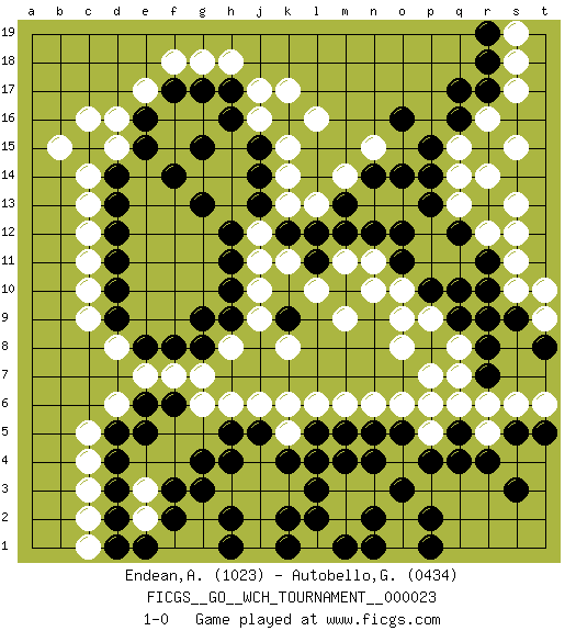 Last move : 1-0 2024 May 10 10:59:36 [Event "FICGS__GO__WCH_TOURNAMENT__000023"] [Site "FICGS"] [Date "2023.09.04"] [Round "1"] [Black "Endean,Andrew"] [White "Autobello,Giovanni"] [Result "1-0"] [Rating 1 "1023"] [Rating 2 "0434"] 1.q4 p5 2.q5 q6 3.o3 o4 4.p4 n3 5.o5 p6 6.n4 o2 7.n2 m3 8.p2 o1 9.p1 n1 10.m1 m2 11.m4 l4 12.l3 l2 13.n1 k3 14.l5 n6 15.n5 m6 16.m5 l6 17.k4 k5 18.l3 l1 19.l4 o6 20.k2 j3 21.k1 j4 22.d4 j2 23.j5 k6 24.h5 j1 25.l2 r5 26.r4 s6 27.s5 r6 28.t5 t6 29.s3 j6 30.f6 h6 31.h4 h3 32.g3 g2 33.g4 g6 34.e8 f7 35.e6 e7 36.g8 g7 37.f8 d6 38.e5 c5 39.d5 c4 40.d3 c3 41.d2 c2 42.d1 c1 43.f2 f1 44.h1 g1 45.h2 h8 46.h9 e2 47.e1 e3 48.f3 j9 49.h10 j10 50.h11 j11 51.h12 j12 52.j13 d8 53.d9 c9 54.d10 k13 55.j14 k14 56.j15 k15 57.g13 c10 58.d11 c11 59.d12 c12 60.d13 c13 61.d14 c14 62.c15 d15 63.e15 d16 64.e16 c16 65.f14 b15 66.k16 j16 67.h16 j17 68.h17 k17 69.g15 l16 70.q16 e17 71.f17 f18 72.g17 h18 73.q10 g18 74.l12 k11 75.l11 l10 76.m10 m11 77.m12 n11 78.n12 n10 79.o12 m9 80.o11 o10 81.p10 p9 82.q9 q8 83.p8 o9 84.r8 q7 85.r7 p7 86.s9 o8 87.g9 l13 88.k12 s10 89.r10 s11 90.r11 r12 91.q12 q13 92.r13 s12 93.p13 q14 94.p14 r14 95.p15 q15 96.r15 s13 97.o16 r16 98.q17 s15 99.r17 s17 100.r18 t9 101.t8 t10 102.r9 s18 103.r19 s19 104.k9 k8 105.m13 m14 106.n14 n15 107.o14 1-0 This go game has been lost on time (started : 2023.09.04 4:1:25) Follow this game move after move (download)If there is no stone on the handicap point, the carpenter's square is dead. (Anonymous) Players are not good because they find tactics, it is about the way to find the positions in which those tactics are hidden. (Luc-Olivier Leclerc)