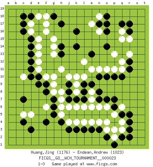 Last move : 1-0 2024 April 6 8:28:9 [Event "FICGS__GO__WCH_TOURNAMENT__000023"] [Site "FICGS"] [Date "2023.10.04"] [Round "1"] [Black "Huang,Jing"] [White "Endean,Andrew"] [Result "1-0"] [Rating 1 "1176"] [Rating 2 "1023"] 1.q17 q15 2.q5 q3 3.d3 d5 4.d15 d17 5.k16 f16 6.c17 d16 7.c16 e15 8.d14 e14 9.d13 e13 10.d12 e12 11.d11 e11 12.e10 f10 13.f9 g10 14.e9 k10 15.o16 r13 16.r16 q16 17.r17 r15 18.r3 q4 19.r4 p5 20.p6 q6 21.r5 o6 22.p7 o4 23.o7 n6 24.n7 m6 25.f4 f6 26.j3 k4 27.k3 j4 28.h4 h5 29.g5 h6 30.g6 h7 31.g7 g8 32.f8 g9 33.r11 q11 34.q10 p11 35.r12 q12 36.p10 o11 37.o10 n11 38.h17 f17 39.o14 p13 40.l3 l4 41.m3 m4 42.n3 n4 43.k14 h11 44.q2 o3 45.o2 p2 46.p1 p3 47.r2 m7 48.n10 m11 49.g18 f18 50.d18 e18 51.c18 g15 52.h14 g14 53.h13 g13 54.m13 l12 55.l9 k9 56.l8 k8 57.l7 l6 58.k7 k6 59.j7 j6 60.j8 h8 61.j9 j10 62.n8 m8 63.m9 l10 64.c4 c5 65.c7 c10 66.d10 m17 67.n17 n18 68.o18 n16 69.o17 1-0 Follow this game move after move (download)Play slow, win slow; play fast, lose fast. (Anonymous) A good programmer is someone who always looks both ways before crossing a one-way street. (Doug Linder)