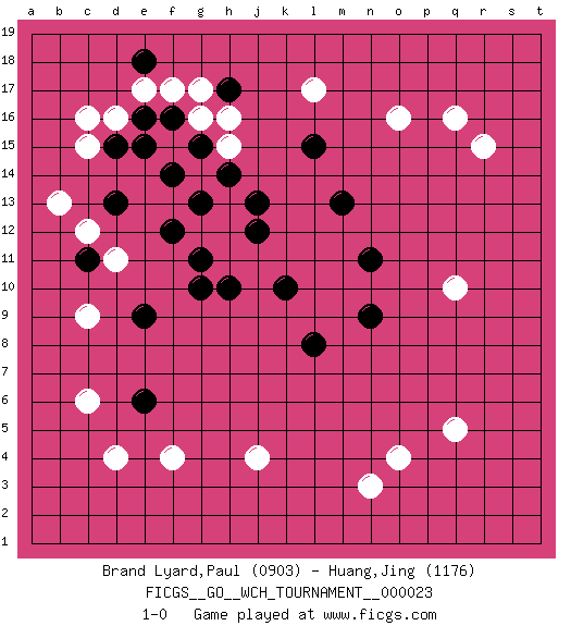 Last move : 1-0 2023 November 30 11:57:1 [Event "FICGS__GO__WCH_TOURNAMENT__000023"] [Site "FICGS"] [Date "2023.10.04"] [Round "1"] [Black "Brand Lyard,Paul"] [White "Huang,Jing"] [Result "1-0"] [Rating 1 "0903"] [Rating 2 "1176"] 1.g13 d4 2.h10 d16 3.c11 q16 4.m13 q5 5.d15 c16 6.l8 j4 7.l15 q10 8.e16 e17 9.e18 f17 10.f16 g17 11.h17 g16 12.g15 h15 13.e15 h16 14.n9 o4 15.g10 c6 16.f12 c15 17.d13 l17 18.e9 c9 19.j12 n3 20.k10 o16 21.j13 r15 22.f14 b13 23.g11 c12 24.e6 f4 25.n11 d11 26.h14 1-0 This go game has been lost on time (started : 2023.10.04 17:49:24) Follow this game move after move (download)Conservative and slow will win. Believe it ! (Anonymous) If passion drives you, let reason holds the reins. (Benjamin Franklin)